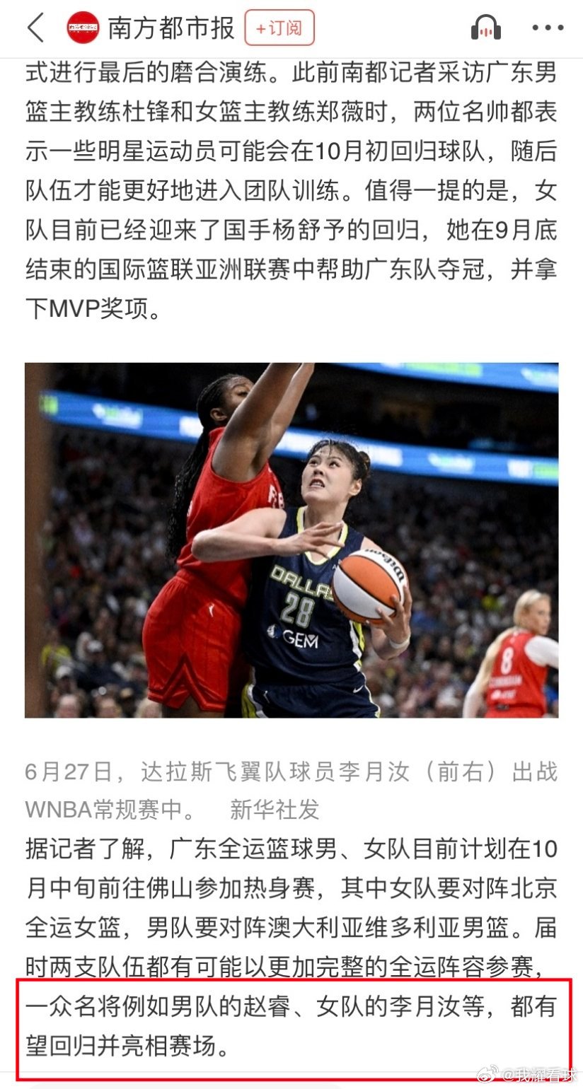 《南方都市报》记者透露:赵睿、李月汝有望在本月中旬的佛山热身赛回归广东全运队