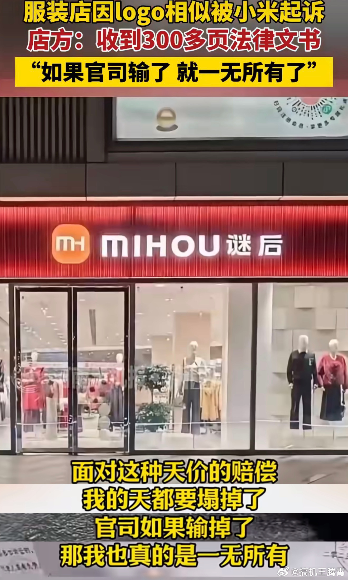 服装店称因logo相似被小米起诉店家收到小米300多页法律文书,声称:“面对这种天价赔偿,天都要塌了,官司要是输掉就一无所有了”。要我说这就属于活该,Logo样式、颜色包括手提袋,不都搞的特别相似么,说难听点纯纯山寨小米。讲道理,你们觉得这算不算是碰瓷?[doge]