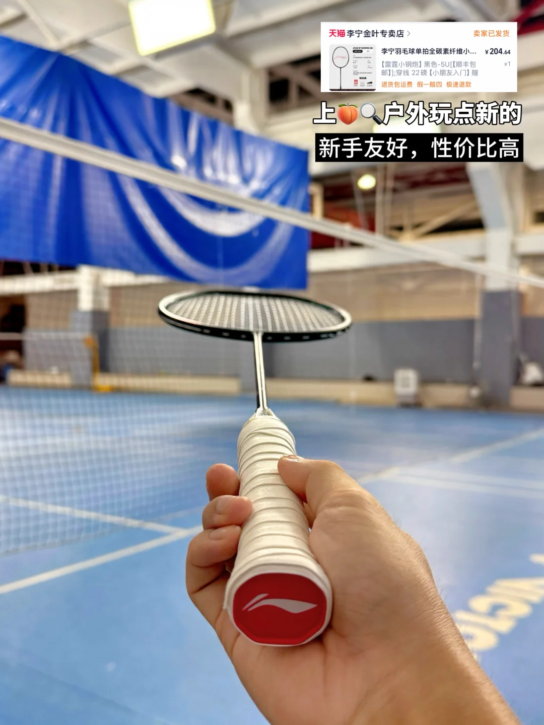 🏸拍子研究了半天,买的李宁的雷霆小钢炮。5U的,很好上手,适合新人。全碳素的拍子超级轻,高远球打得很轻松,偶尔进攻杀个球,手感也很爽。