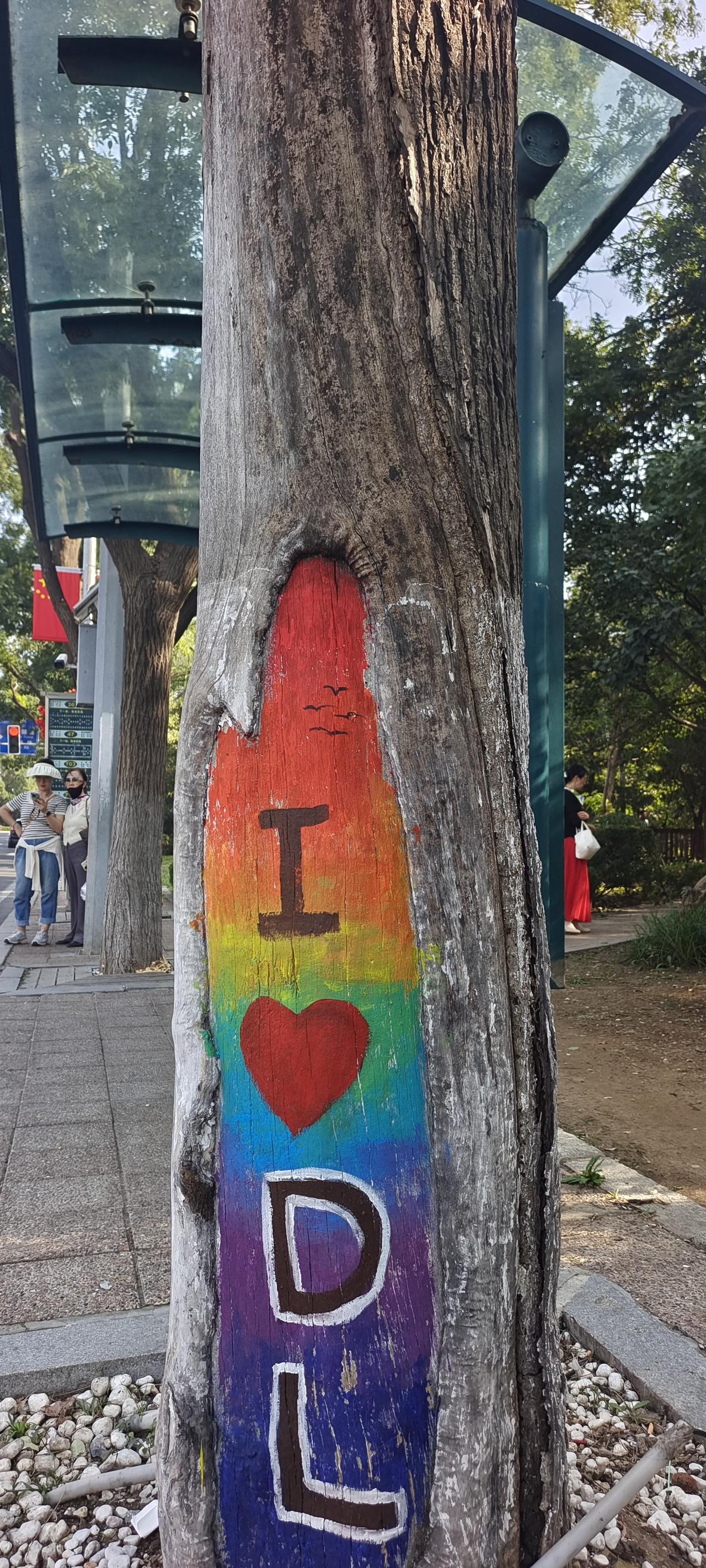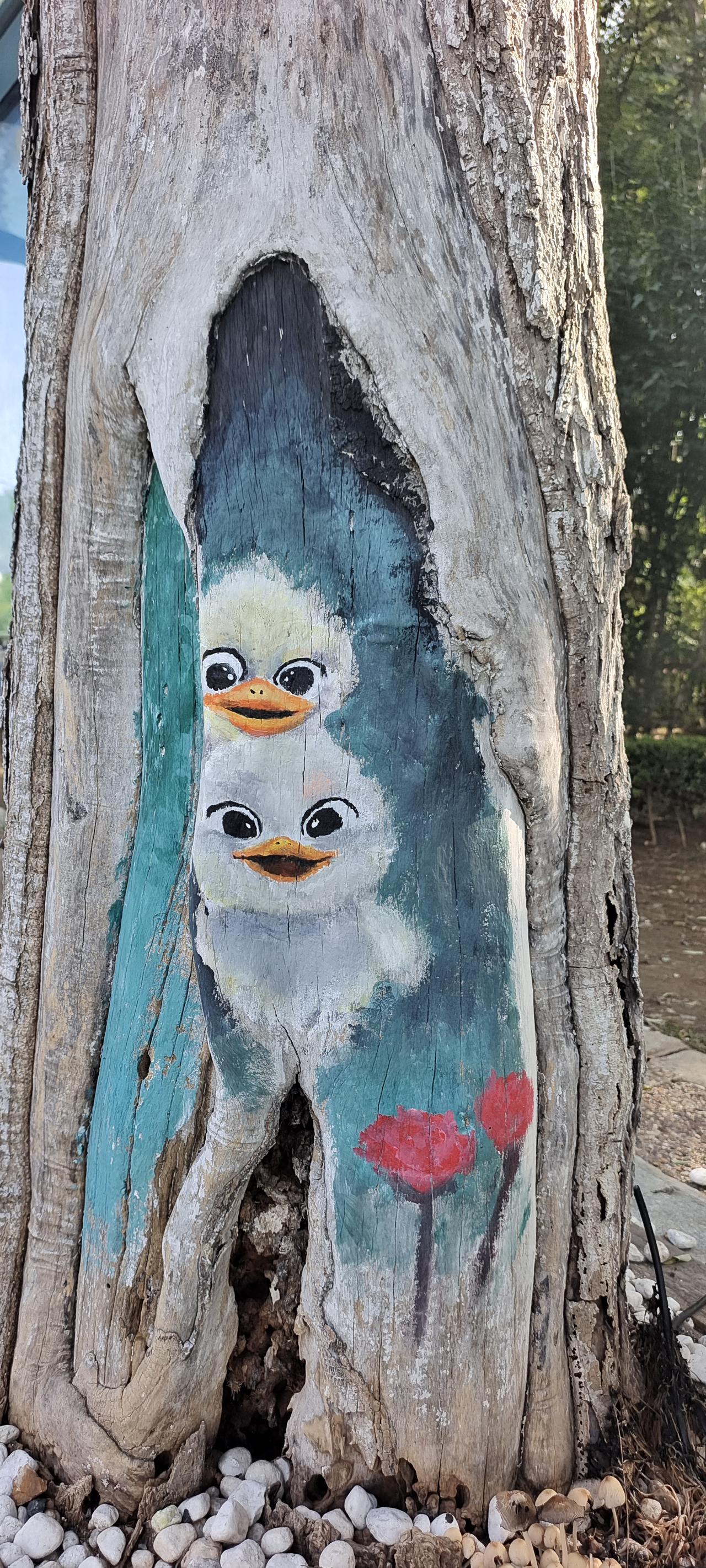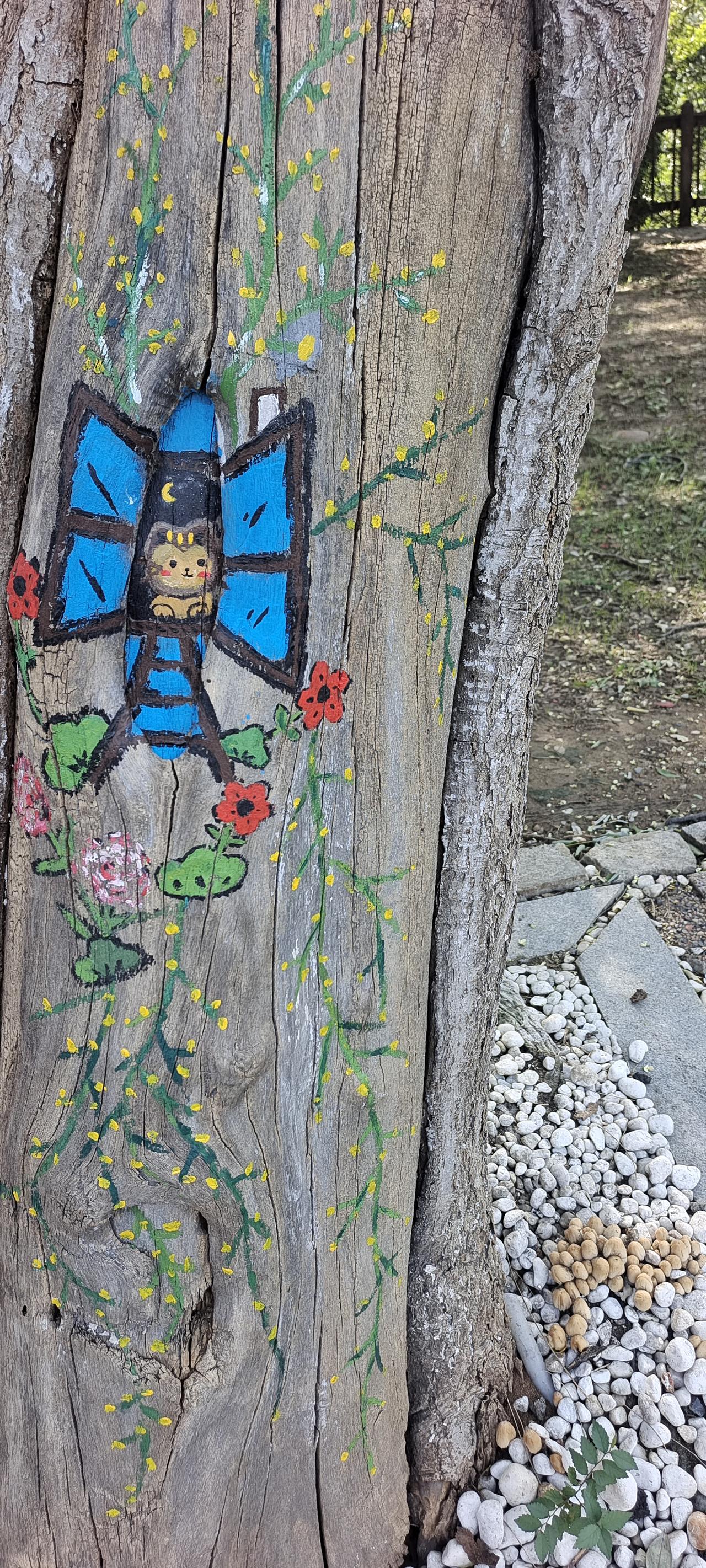 植物园中南路的道边儿上。树洞里面儿花的花清新可爱。色彩斑斓,动感十足。浓浓的童话画风,非常有趣。