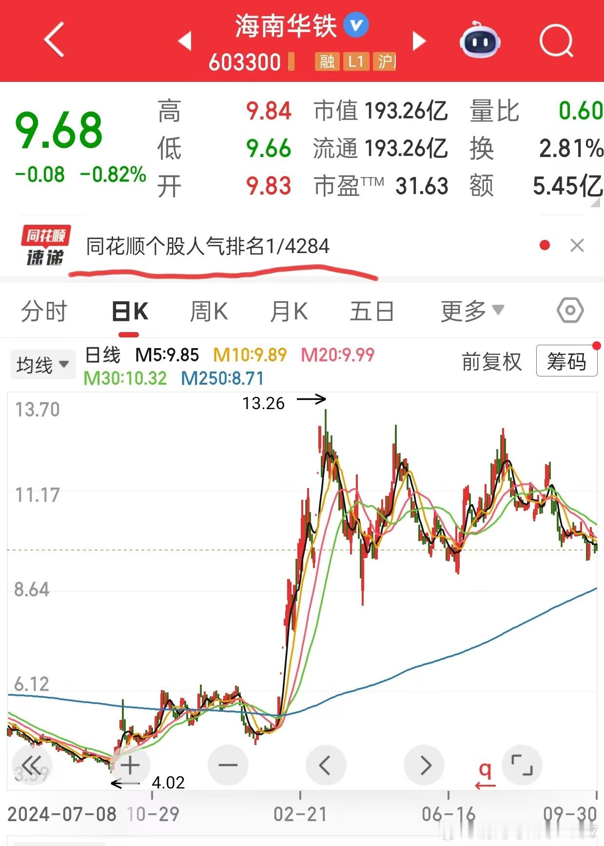 海南华铁,同花顺人气排名第一。要滑铁卢了吗?