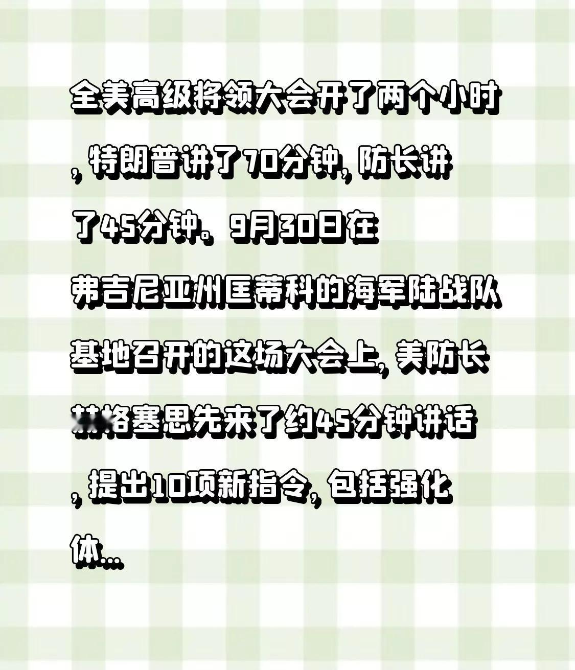 全美高级将领大会开了两个小时,特朗普讲了70分钟,防长讲了45分钟。 9月30日在弗吉尼亚州匡蒂科的海军陆战队基地召开的这场大会上,美防长赫格塞思先来了约45分钟讲话,提出10项新指令,包括强化体能标准及测试、加强仪容要求,不许留胡须,还严厉批评了发胖的士兵和将领。 接着出场的是特朗普,讲了近70分钟,称美国城市应搞成“军事训练场”。台下军方高层几乎全程沉默,这反应有人觉得符合“无党派”准则,也有人说让军事领导人陷入党派闹剧很可耻。 防长赫格塞思还发出“最后通牒”,让军官要么听话要么辞职。