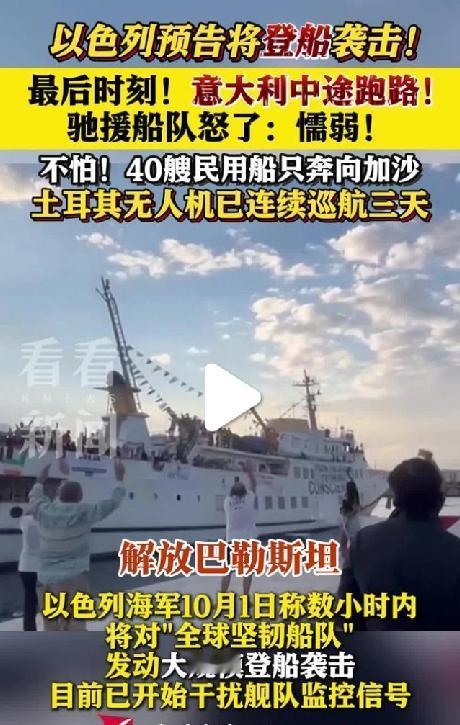 果然应验!倒戈、跑路,一气呵成,而且是跑出加速度,比二战时还快 梅洛尼与桑切斯在3天前,宣布派军舰护航加沙救援队,可以说赢得掌声一片,然而,仅仅72小时后,这事儿就来了大喘气一样的反转。 在以军宣布登船袭击后,意军舰再现二战时的倒戈一幕,又跑了…… 这一幕在西方迅速冲上热搜,最有意思的评论是,意大利还是那个意大利,逃跑、倒戈一气呵成…… 透过现象看本质,啥五眼联盟、G7成员,真遇到事,一个比一个跑得快,而且还是绝不回头望一眼的那种。