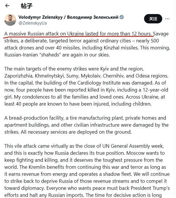 俄军持续空袭12小时,大火烧到第二天早上。泽连斯基在社交媒体上发文称,俄罗斯对乌克兰全境发动了一场持续12小时的大规模空袭,基辅、扎波罗热和赫梅利尼茨基多地遭到袭击。 这事儿说起来真让人堵心,俄罗斯军队又在2025年9月27日晚间对乌克兰全境来了一波猛烈的空袭,从晚上8点半左右开始,一直拖到第二天早上9点多,足足超过12个小时。乌克兰空军后来统计,俄罗斯扔出了595架无人机和48枚导弹,其中包括巡航导弹和弹道导弹,目标直指能源设施、工厂和机场啥的。基辅首当其冲,市区20多个地方中招,扎波罗热和赫梅利尼茨基这些城市也没躲过去,爆炸声和防空火力把夜空照得亮堂堂的。结果呢,至少4人丧生,70多人受伤,其中基辅一所心脏病诊所就死了2个人,还有小孩在内。扎波罗热那边,31人挂彩,3个孩子进了医院,全是平民建筑挨炸的锅。 你想想看,这不是头一回了,但这次规模大得离谱。俄罗斯国防部那边倒好,声称是精准打击乌克兰军工企业和空军基地,说是为了回击乌克兰的无人机袭击。可乌克兰官方数据摆在那儿,打击点大多是民用基础设施,基辅市区电力和燃气中断了好几千户人家,街道上到处是碎玻璃和扭曲的铁条。赫梅利尼茨基机场跑道被炸裂,停着的飞机残骸冒黑烟,仓库区火光冲天,消防队忙到天亮才勉强压住火头。扎波罗热工业园子也遭殃,导弹砸中油罐,火烧得旺盛,第二天早上还见着烟柱子直冲云霄。乌克兰空军拦截了568架无人机和43枚导弹,干得不错,但漏网之鱼还是造成了不小破坏。整个过程,邻国波兰都得紧急关闭东南部空域,出动战机巡逻,生怕波及边境。 泽连斯基这家伙,28日一早就在Telegram上发帖,话说得直白又硬气,直呼这是“卑鄙而懦弱”的袭击,俄罗斯就是在故意针对老百姓和城市。帖子里他点名了基辅、扎波罗热和赫梅利尼茨基,说袭击波次接连不断,数百架无人机和导弹像不要钱似的砸过来,简直是蓄意的恐怖行为。他还提了前一天的事儿,27日他在纽约联合国大会上刚和特朗普碰头,谈了乌克兰的反击计划,结果当晚就挨了这记闷棍。泽连斯基没少抱怨,俄罗斯这是在拖延战争,拒绝外交途径,还想把火烧到欧洲其他地方。他呼吁欧盟和美国赶紧加码制裁,尤其是针对俄罗斯的能源船队和炼油厂,说这能掐住他们的命脉。 说起背景,这场空袭得放进整个俄乌冲突的大框架里看。2022年俄罗斯入侵以来,这样的无人机导弹雨就没停过,但2025年下半年频率更高了。俄罗斯靠着伊朗和朝鲜的补给,Shahed型无人机源源不断,乌克兰的爱国者系统虽说拦截率高,可数量跟不上消耗。袭击前一天,泽连斯基还在记者会上吹嘘以色列刚送来的两套爱国者防空系统已经在运行一个月,另一套也快到货。可惜,这次行动里系统虽挡住了大头,但基辅能源站还是中了招,变电站外墙崩了,火球蹿起老高。俄罗斯那边呢,普京的策略没变,还是想通过能源打击逼乌克兰让步,冬天一到,缺电缺暖气就能让民众压力山大。 国际反应来得快,但力度呢,还得打问号。北约秘书长在布鲁塞尔紧急表态,说这袭击证明俄罗斯在升级对抗,得加强波罗的海和黑海的防空部署。丹麦和罗马尼亚报告说,俄罗斯无人机还窜进了他们的领空,丹麦军方直接禁飞所有民用无人机,为欧盟峰会清场。波兰空军出动F-16,护着边境线,欧盟委员会主席冯德莱恩在推特上发声,支持乌克兰的自卫权,还提了“无人机墙”计划,就是在边境线上布满反无人机网。特朗普那边,最近态度有点松动,上周在阿拉斯加和普京会晤后,他公开说乌克兰有机会收复失地,因为俄罗斯经济扛不住长期消耗。可美国国会里两党扯皮,军援法案卡着,泽连斯基去华盛顿游说时,带了受袭城市的照片,强调得加紧送防空导弹。 乌克兰这边,损失不小,但韧性还在。基辅市长克利奇科说,市区2千多户没电没气,救援队清扫了上千吨废墟,医院优先抢救伤员。扎波罗热州长费多罗夫报告,导弹砸了8发,平民伤亡重,孩子们的公寓楼直接被波及。赫梅利尼茨基那边,3人死亡,主要是炸弹碎片落的锅。整个国家电网摇摇欲坠,政府紧急调发电机和备用电源,民众排队领蜡烛和电池。泽连斯基没闲着,28日下午就去视察受损现场,推动拨款修电网,还在视频讲话里重申,会反击回去,用西方援助的导弹打俄罗斯的后勤线。果然,袭击后没几天,乌克兰无人机就炸了俄罗斯几个油库。