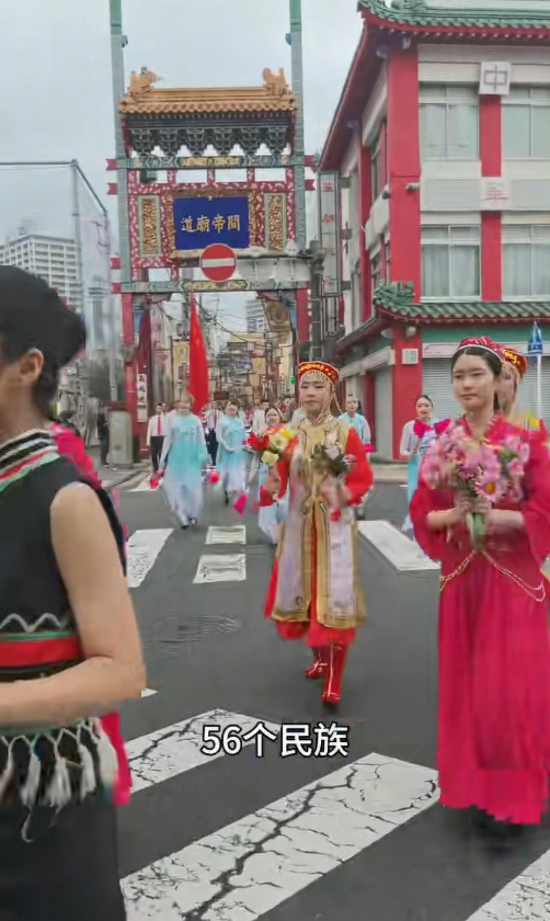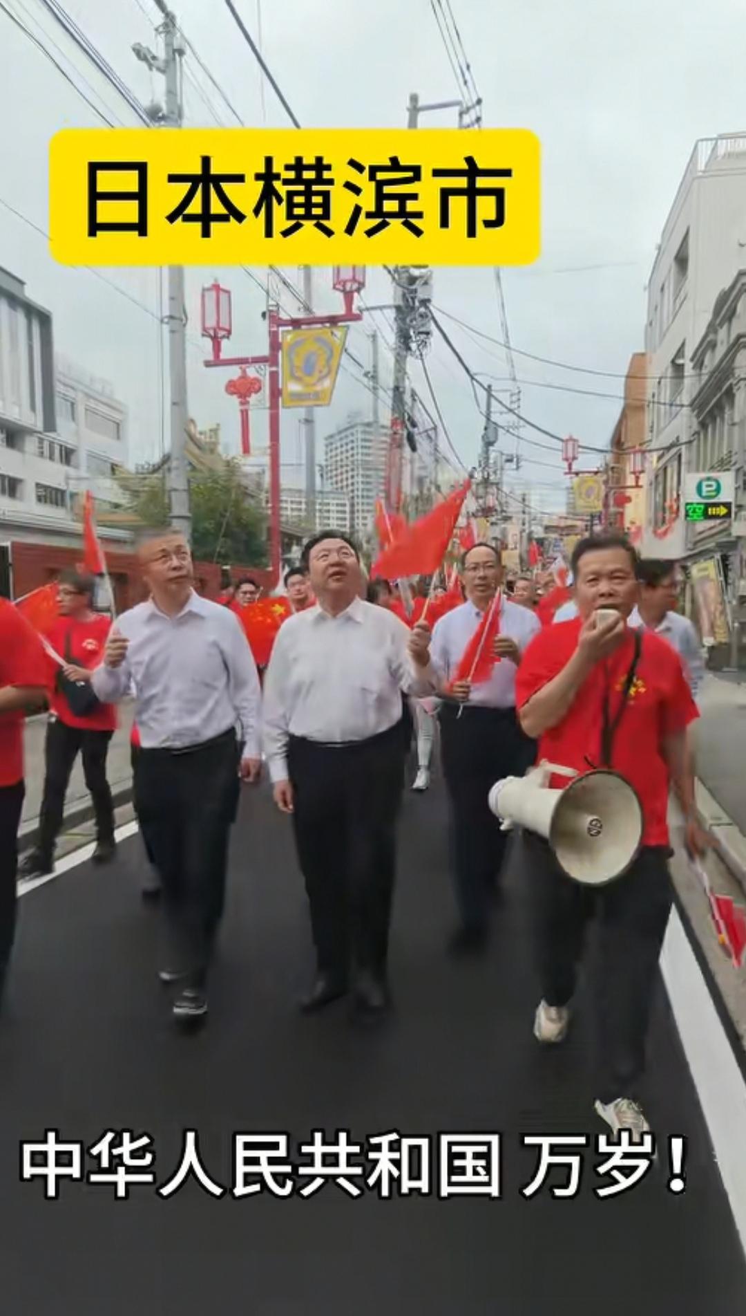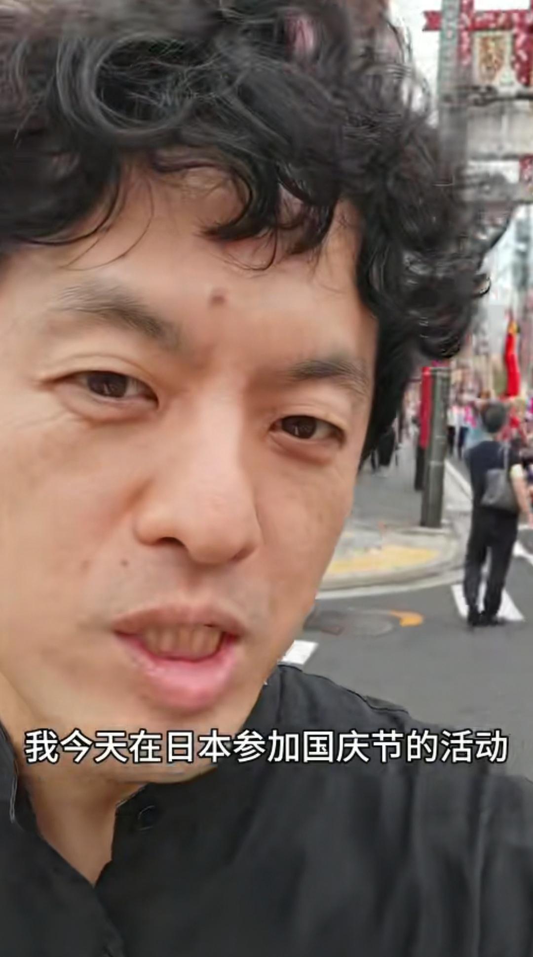 10月1日,日本导演竹内亮在日本参加了中国的国庆节活动,活动地点在日本横滨中华街,这条街道的门牌坊上刻的字是“关帝庙道”。 庆祝活动搞得很隆重,街头的人群排列成游行队伍,大家手中拿着中国国旗和日本国旗,领头的两位男士穿着白衬衫,其他人员穿着红色短袖,有人拿着喇叭大喊“中华人民共和国万岁”,然后大家跟着一起喊叫。 还有穿着56个民族服装的女士手上拿着花欢快的跟着游行队伍。还有比亚迪车上贴着宣传“庆祝国庆”的字样。庆祝队伍中还有一群小朋友以及舞狮子表演。拿着日本国旗的也在高声喊叫“中日友好万岁”。 不得不说大家都在牵挂着祖国,即使身在异国,外国友人也为中国的强大发自内心的祝福。