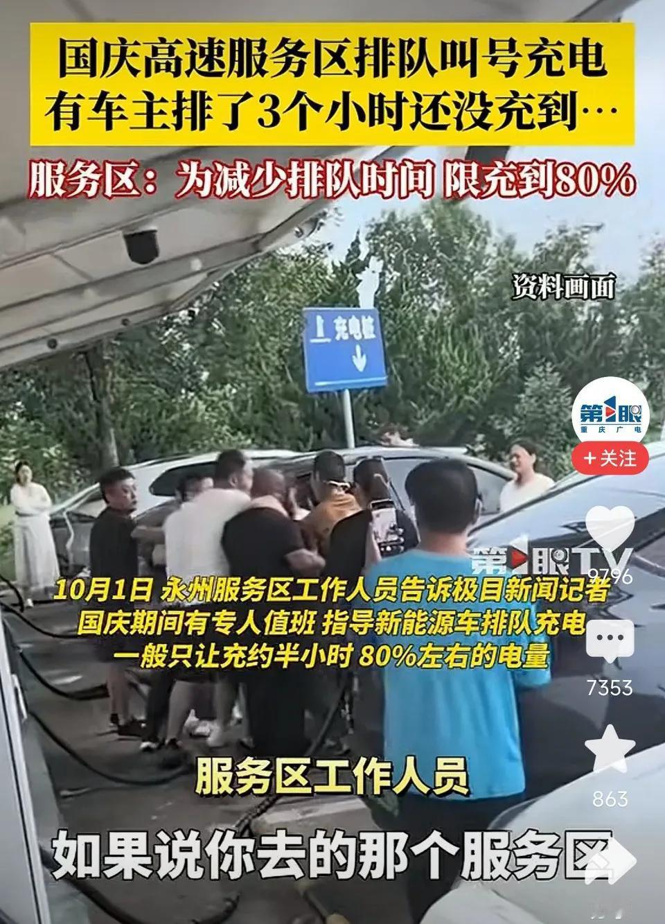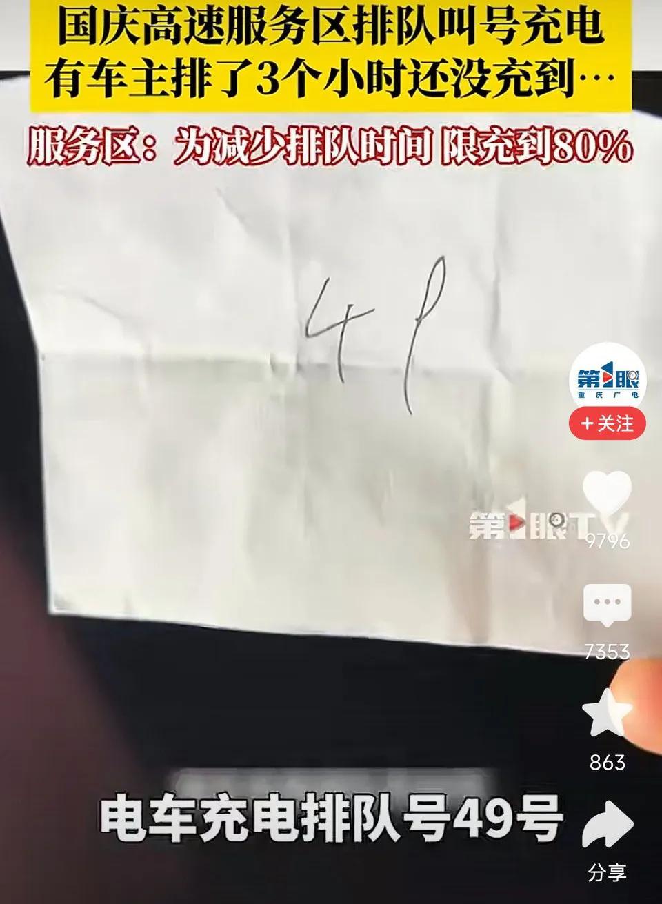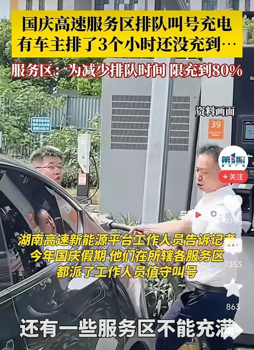 国庆高速服务区排队叫号充电!有车主排到49号,等待三个多小时!高速服务区每车限充到80%。 网友表示: 我不是说电车不好,上下班接孩子,买菜,肯定电车好,但是跑高速300公里以上的,特别是节假日,还是油车有优势!很多家庭都是油车有,电车也有!这样最好的! 有没有这种可能,研究出一种燃料,几分钟注入车内,可以续航个五六百公里,这样就省了排队充电。 油车主:等的就是这个时候 !电车主:只要顶住这几天我就香了! 规划好,电车下高速,找个充电,然后再上高速,比在高速上充快多了,而且还能吃个饭休息一下。 现在随便下服务区那那都能找到充电桩,我今天成都到贵阳,中途下高速三分钟就找到充电桩40分钟充满,顺便吃了个饭,为什么非要在高速上去排队呢?真是无法形容! 电车跑高速绝对安全,跑300公里再休息三小时充电,决对的不会疲劳驾驶! 汽车充电时间 新能源车快充站 充电排队