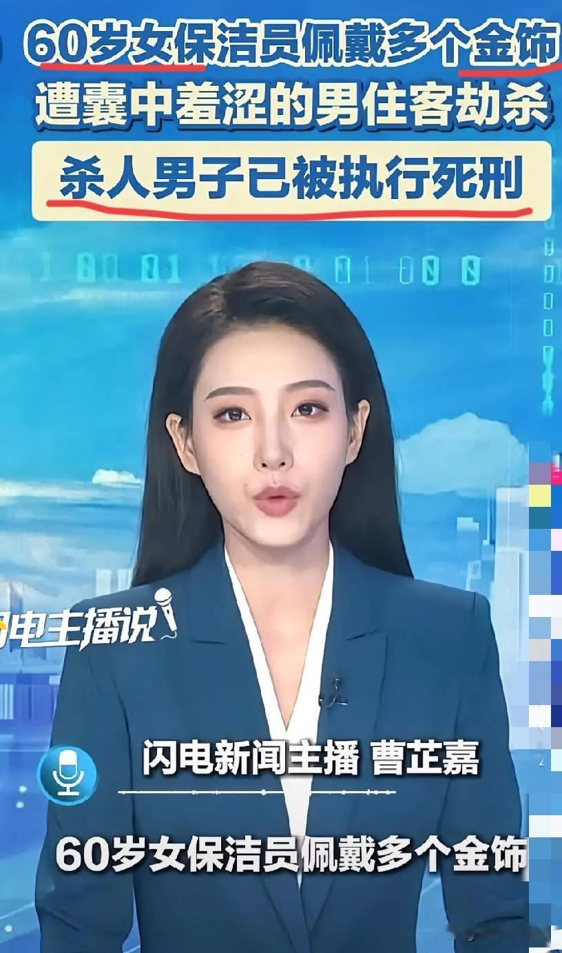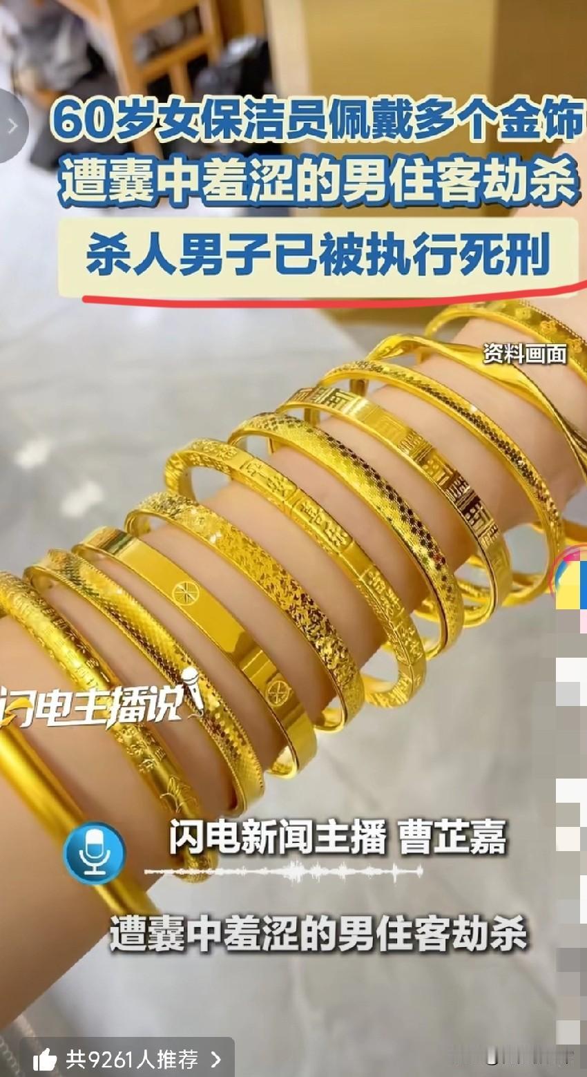 就因为戴了些金首饰,人没了! 60岁的女保洁员怎么也没想到,自己日常佩戴的金饰,竟成了催命符,被囊中羞涩的男住客残忍劫杀。 近日,这起案件的凶手已被执行死刑。案件中,王某某看到女保洁员佩戴较多黄金饰品,便心生歹念。 他退房后换装返回宾馆,假借选房让保洁员带路进入房间,趁其不备将其拉至床上,通过扼颈、塑料袋捂口鼻、透明宽胶带缠绕口鼻等方式,致保洁员机械性窒息死亡。 之后,王某某劫得黄金手镯一个、黄金戒指一枚、价值22915元的黄金项链一条及耳环一对,还将保洁员的手机带走毁弃。 2024年4月25日,安庆市中级人民法院认定王某某犯抢劫罪,判处死刑,剥夺政治权利终身,并处没收个人全部财产。 王某某提出上诉后,安徽省高级人民法院于2024年10月10日驳回上诉,维持原判,并依法报请最高人民法院核准。最高人民法院核准后下达执行死刑命令,2025年8月8日,法院将王某某验明正身,押赴刑场执行死刑。 这起案件提醒我们,安全意识不容忽视,同时也彰显了法律对暴力犯罪的零容忍,任何漠视生命、实施犯罪的行为都将受到法律的严惩。
