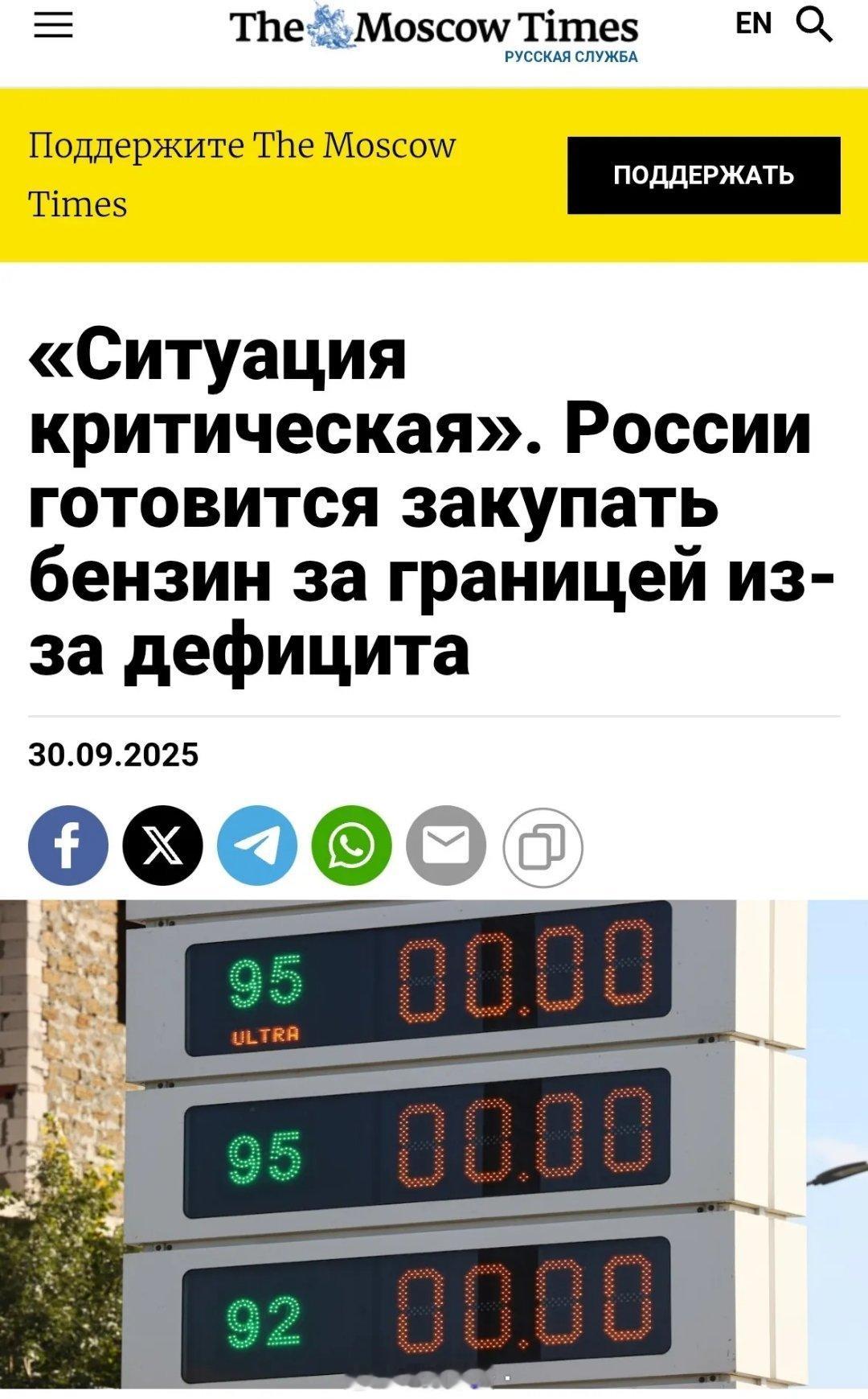 俄罗斯正式宣布成为汽油进口国,市场供应缺口在20%,【情况危急】。