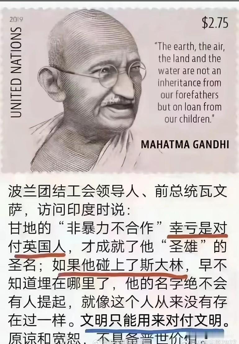 瓦文莎说的好,甘地非暴力与英国的文明对话,成就了印度国旗不是血色。 英国文明?印度独立前一年还在闹饥荒,丘吉尔可是公开说印度人像兔子饿死活该的。看过一部印度电影,英国殖民者拿着棍子把几十个人群打的像猪头,撤下马上又有几百人上去让他打,过后又是几百人,打人者手都酸了,看的人都郁闷了 甘地这老东西,蒋委员长夫妇访问甘地,说到中国抗战如何艰难,他竟然说,只要中国不抵抗,任凭日本杀,就没事了,蒋夫妇被他的无知言论雷倒了。