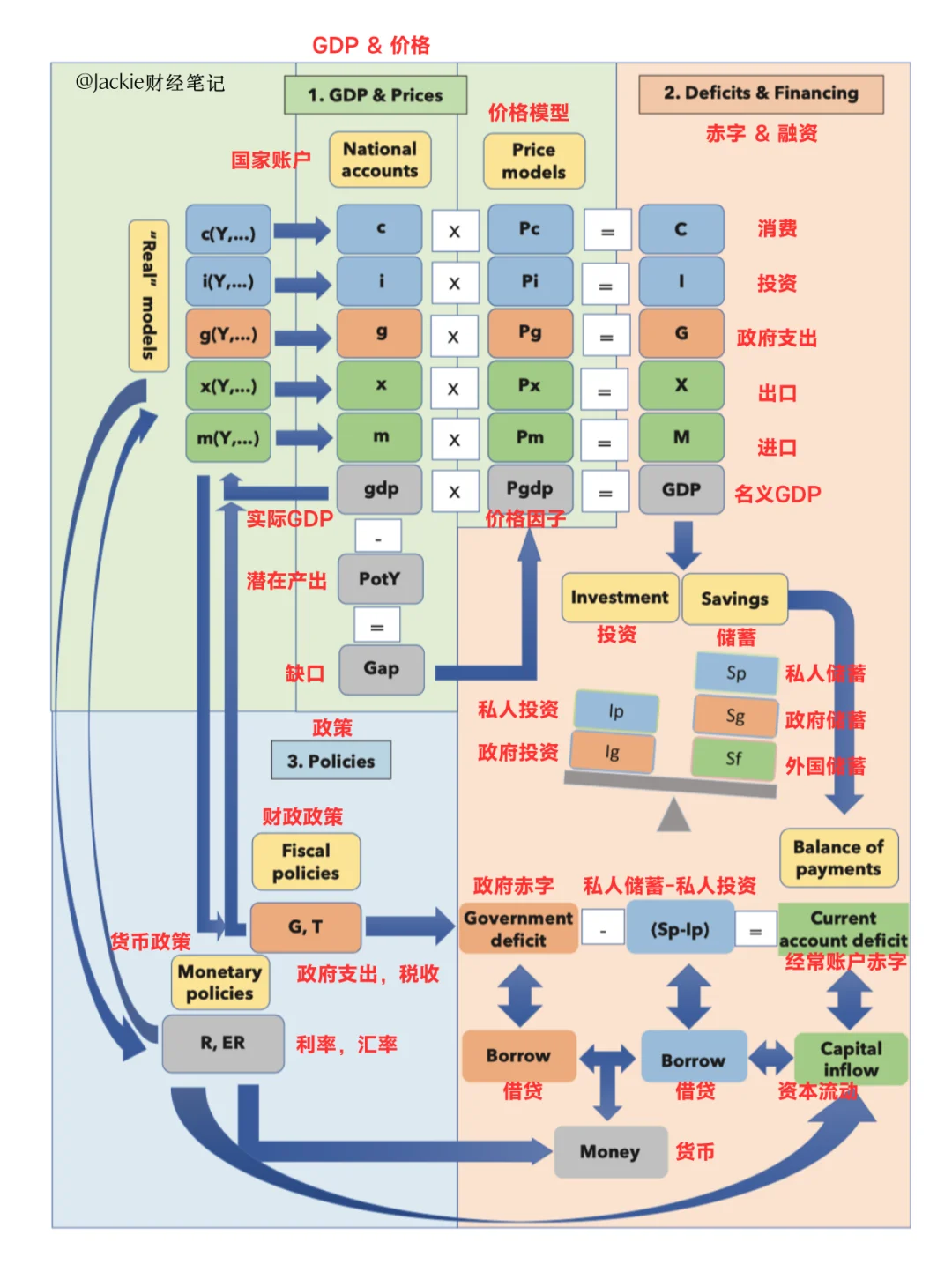 先给大家划重点:这张图是 MFT 的「灵魂框架」,把复杂的宏观经济拆成「GDP & 价格」「赤字 & 融资」「政策」三大模块,每个模块环环相扣,像搭积木一样清晰。