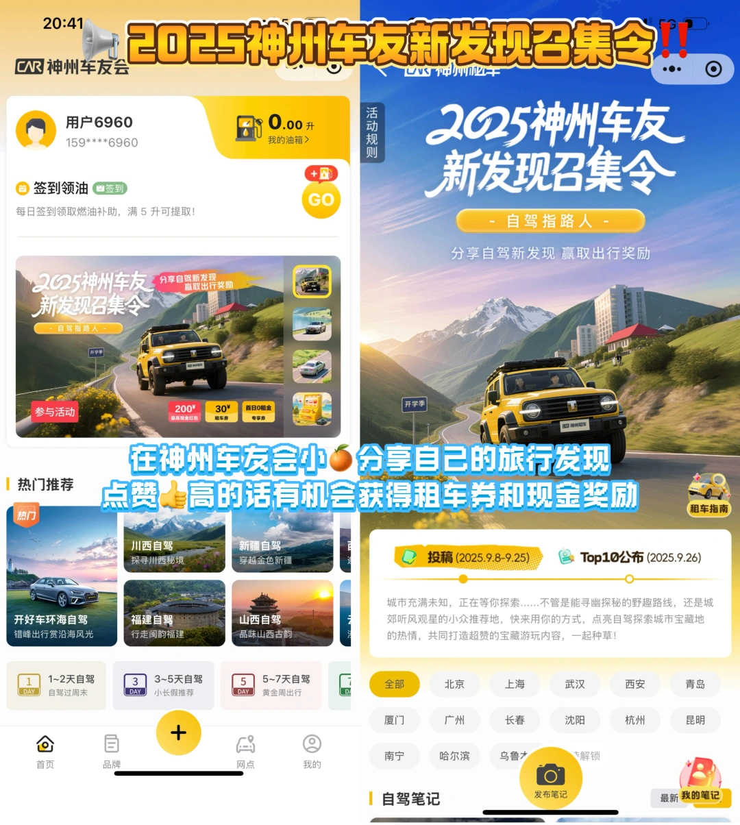 🔈最近神州租车发布了《2025神州车友新发现召集令》 ,只要在神州车友会小🍊分享自己的旅行发现,点赞高的话有机会获得租车券和现金奖励!快来跟我一起参与吧!