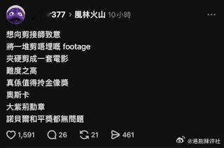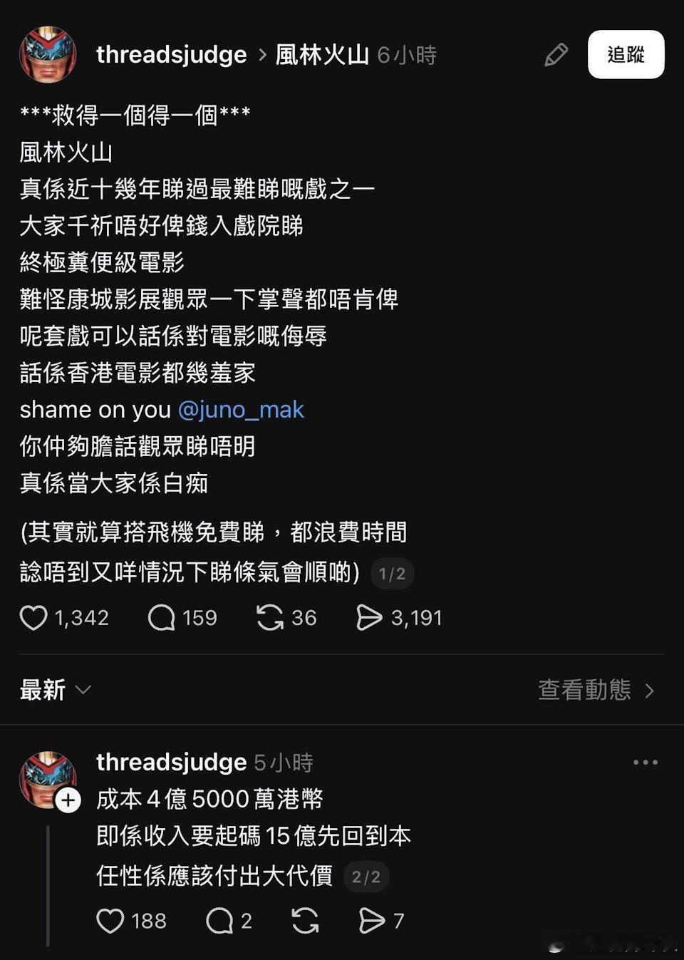 萬眾期待的電影《風林山山》終於在10月1日全國及香港同步上映,這套醞釀8年,製作費四億的大電影,早前在康城影展播出,小紅書一片劣評,當時大家都半信半疑,以為是小粉紅刷流量的技倆,昨日電影正式上映,threads出現很多觀後感,當中有不少負評,其中有網民狠批《風林火山》為終極糞便級電影,有超過3千多分享。