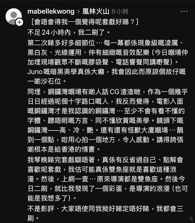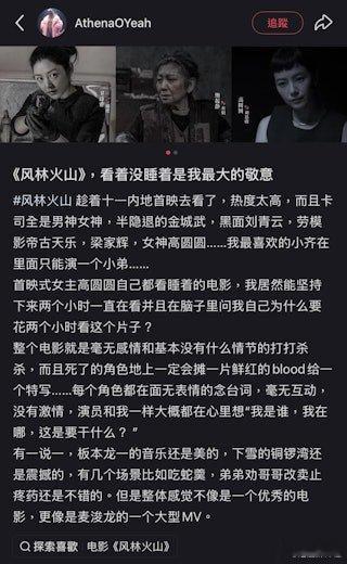 當然這位博主較為激進,但亦有不少人批評電影太過支離破碎,覺得剪接師好厲害,可以將一堆不合理的footage剪成一套電影,但亦有人不足24小時二刷《風林火山》,大讚畫面現象級凌厲,Juno暗黑美學大癲,當日內地上映,在小紅書亦有不少網民發表意見,大家都讚電影拍得很美,但看了半小時就睡著,亦有網民覺得電影是稀巴爛⋯⋯