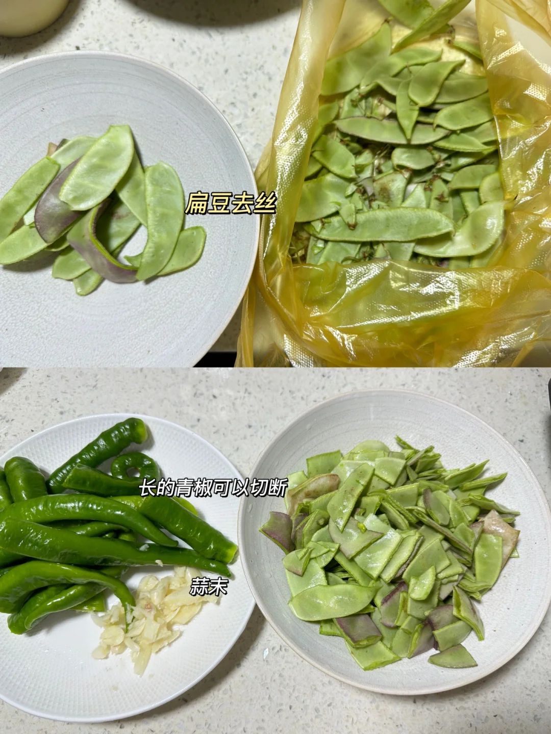 2⃣️:锅里倒油(有猪油放猪油)炒香蒜末,再把青椒扁豆放进来翻炒 加一丢丢白糖 鸡精,一丢丢酱油翻炒上色。再炒个一分钟就行啦
