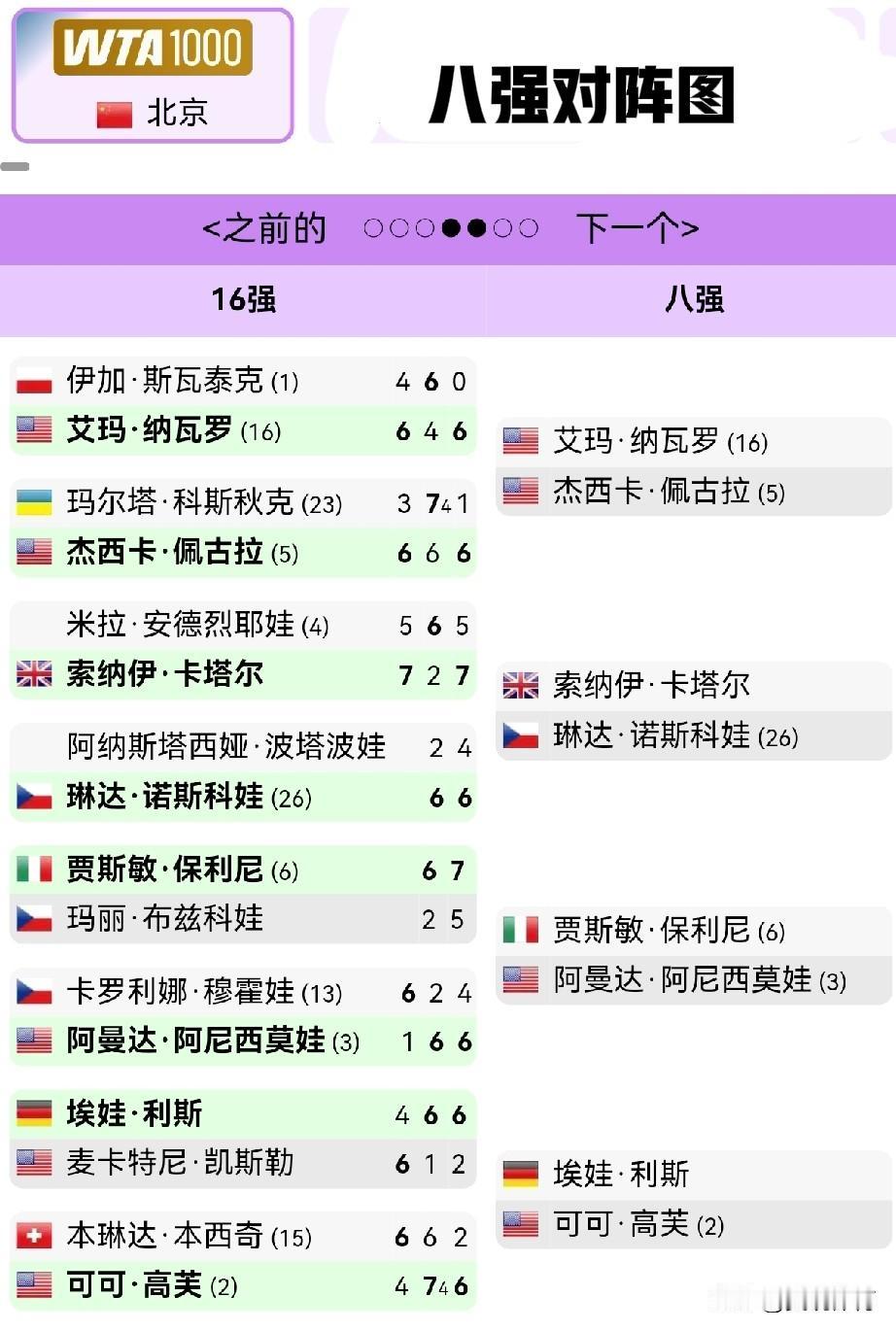 中网八分之一决赛详细战报 (见图) 八强对阵图如下 上半区: 艾玛·纳瓦罗 (16) 杰西卡·佩古拉 (5) 索纳伊·卡塔尔 琳达·诺斯科娃 (26) 下半区: 贾斯敏·保利尼 (6) 阿曼达·阿尼西莫娃 (3) 埃娃·利斯 可可·高芙 (2)