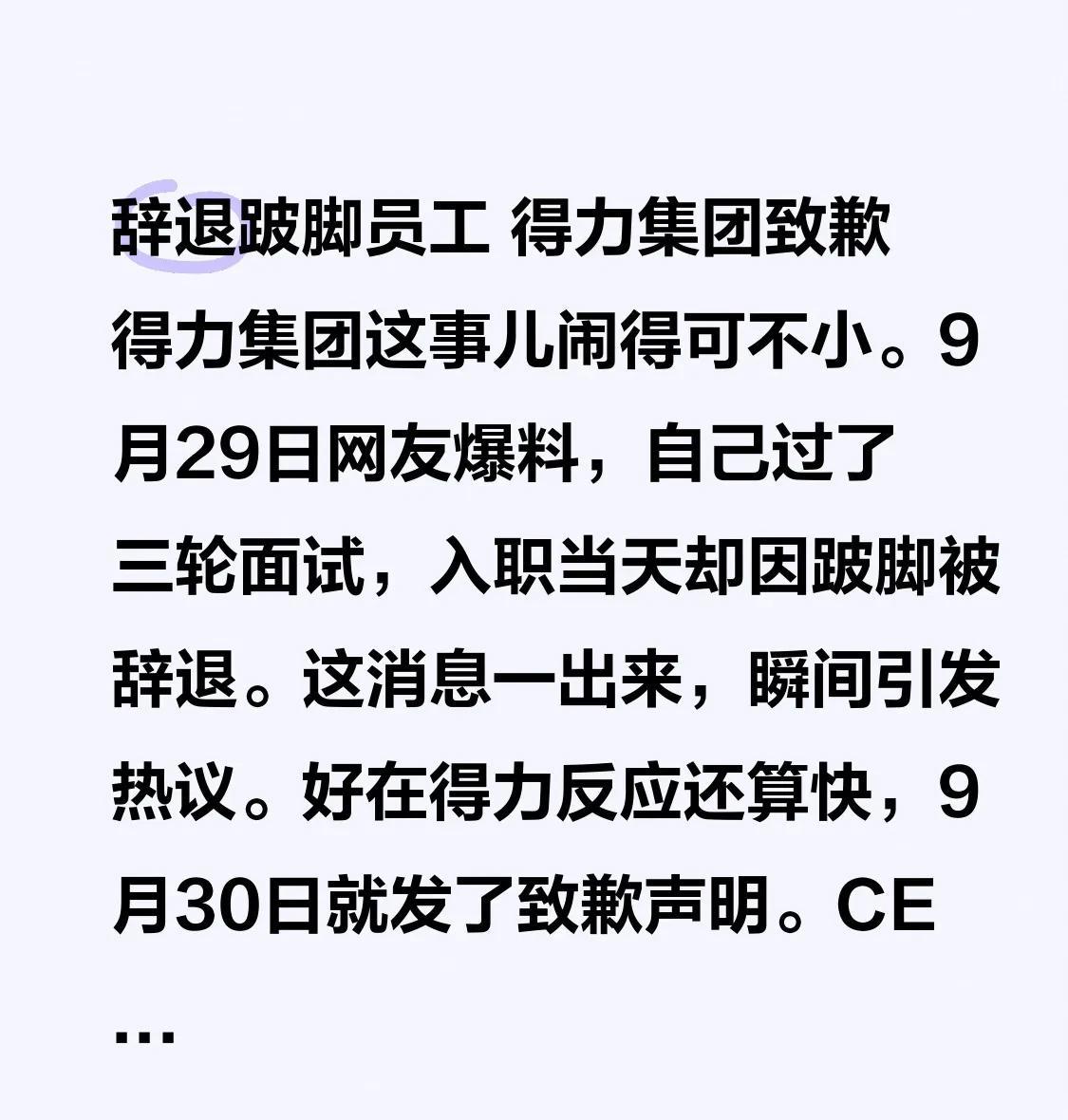 辞退跛脚员工得力集团致歉辞退跛脚员工,得力集团致歉 得力集团此次事件引发了广