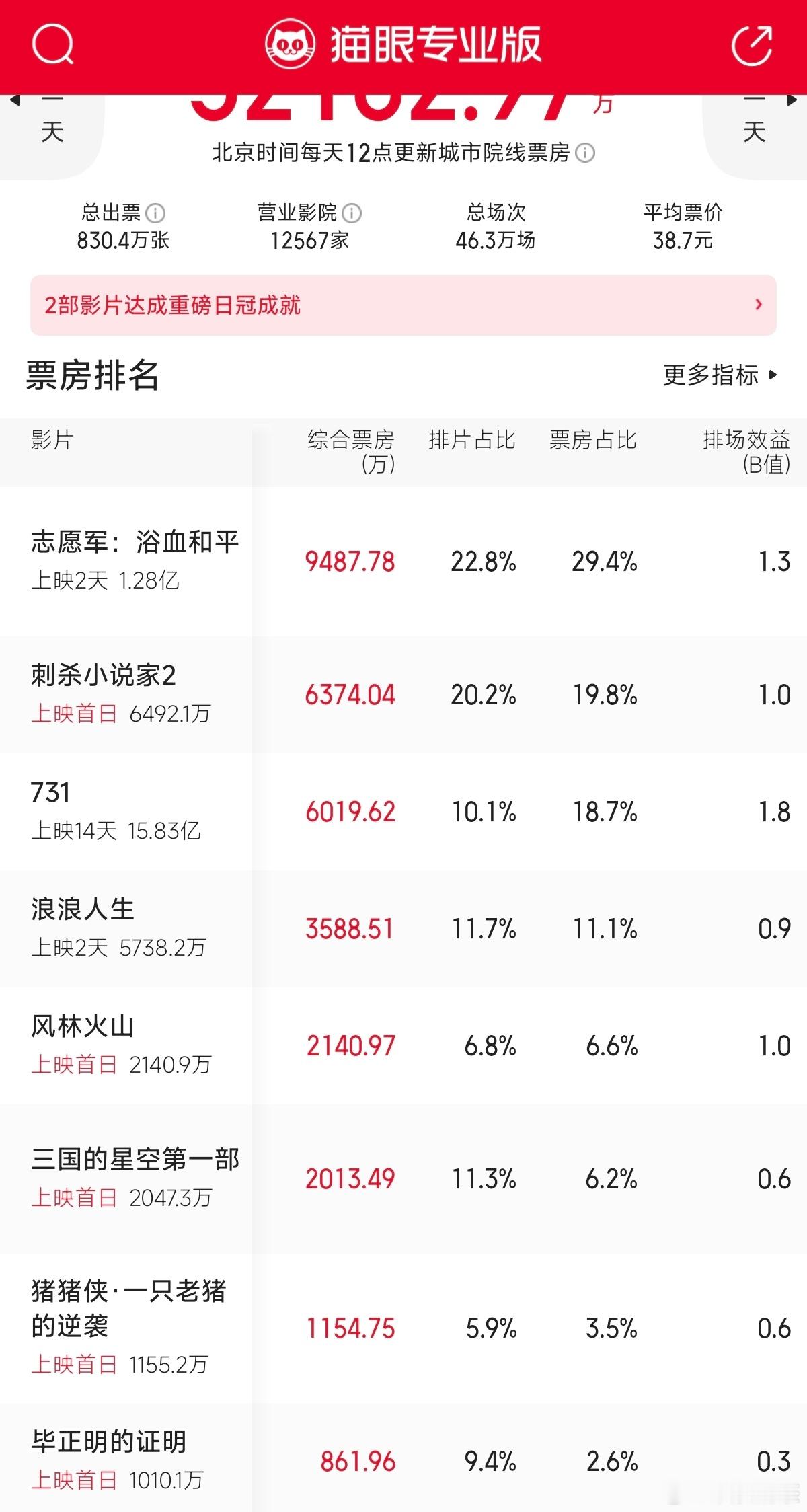 《志愿军》 排片占比23.7%👉🏻21.1%