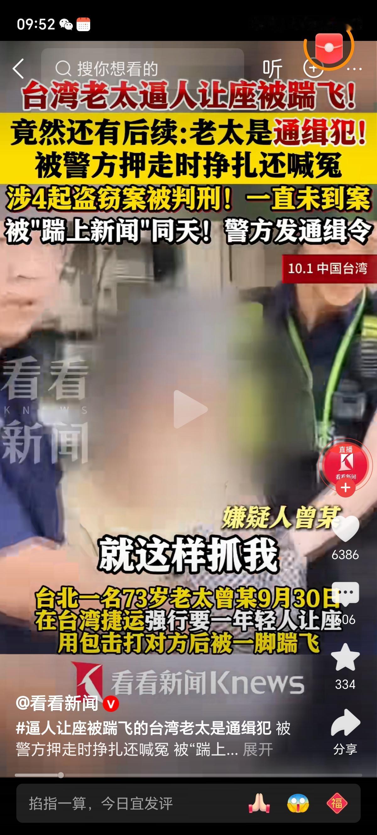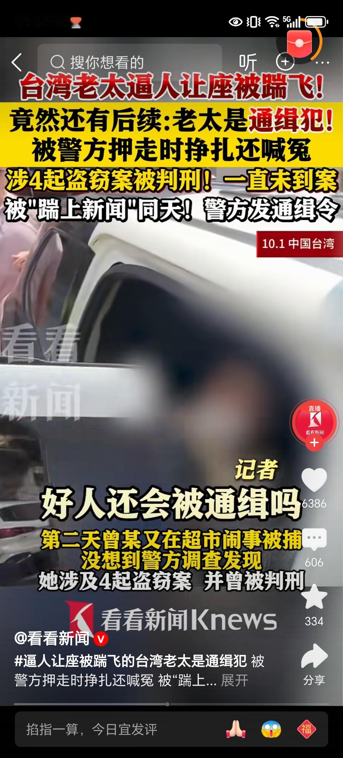 事实证明不作死就不会死,都是通缉犯了,不老老实实装鹌鹑,还出来欺负年轻人,仗着自己岁数大就随便道德绑架别人让座,人家隐忍她还用东西打人,没想到年轻人忍不下去了一脚踹走她,不知道算不算正当防卫。 这真是坏人变老了啊,岁数大了不带脑子了就凭本能干坏事了,在公交车闹事被踹了还不消停,才过一天就去超市闹事了,这回直接进拘留所了,老底都被揭穿了。 事情的经过是这样的: 9月29日下午,台湾台北捷运淡水信义线列车上爆发的让座冲突引发热议:73岁的曾姓老太强行要求年轻乘客让出“博爱座”,遭拒后用提袋击打对方,最终被忍无可忍的年轻人一脚踹至对面座位。更令人震惊的是,次日老太因在超市闹事被捕,警方核查发现其竟是涉嫌多起盗窃案的通缉犯。 事发正值乘车高峰,虽车厢内有空座,曾老太仍径直走向坐在“博爱座”的年轻乘客,强硬要求对方让座。在遭到明确拒绝后,老太情绪失控,举起手提袋反复击打年轻人腿部进行驱赶。目击者称,年轻人起初试图隐忍,见老太挑衅不止,便将随身物品递给身旁乘客,起身一脚将老太踹翻至对面空位。老太被踹后短暂发懵,口中直呼“他很可怕”,随即表示要报警处理。 现场乘客迅速介入制止,列车到站后捷运人员到场处置。经检查,老太身体未受严重伤害,双方均未立即就医。涉事年轻人称因对方持续挑衅才冲动动手,而老太则指责其行为粗暴。事件视频曝光后,网友看法两极:部分人认为老太“倚老卖老”在先,年轻人反击属无奈;也有人指出暴力反击并非合理解决方式。 本以为是普通的公共秩序纠纷,后续发展却出人意料。9月30日,曾老太在台北市大同区一间超市闹事,店员报警后,警方到场核查身份时发现惊人情况:老太因涉嫌4起盗窃案已被判刑55天,却一直未到案执行,警方恰于9月30日发布了对其的通缉令。讽刺的是,她被通缉的同一天,因让座冲突被踹飞的画面已登上当地新闻头版。 被捕时,曾老太情绪激动,不断挣扎嘶吼,高喊“都是假的!”“你们冤枉我!我是好人!”,面对记者“好人为何被通缉”的追问,其语塞后被警方强行带离。目前,老太已被依法羁押,待执行此前盗窃案的刑期,而捷运让座冲突也在进一步调查中。