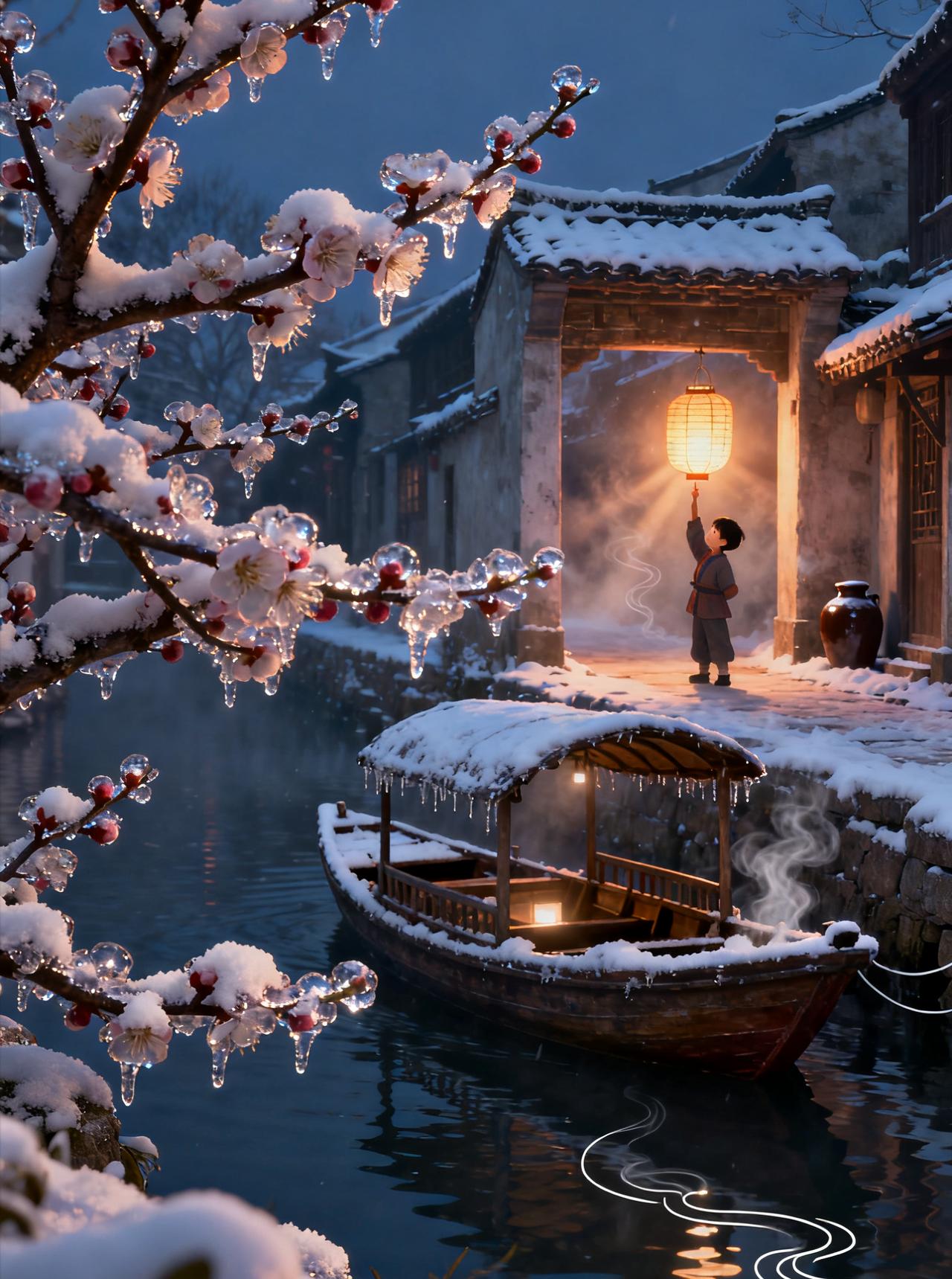 《游子归乡谣》 车笛惊破暮云柔 梅枝蘸雪点客舟 檐下新醅烫欲沸 稚子提灯