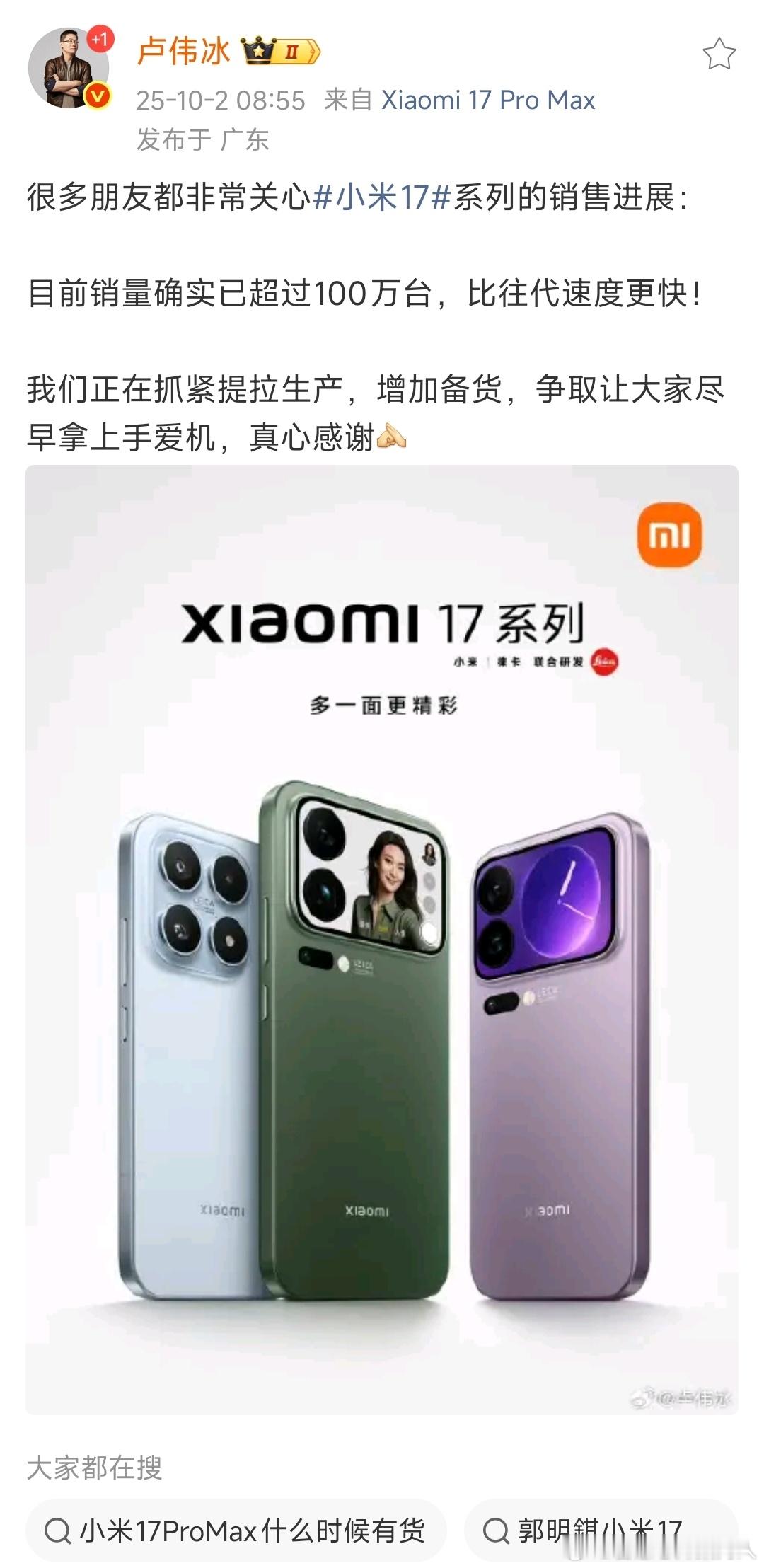 销售破百万速度在加快,同时小米17系列销售结构发生大变化,估计和iPhone一样,以后靠pro max和pro冲量,均价提升还是非常惊人的。