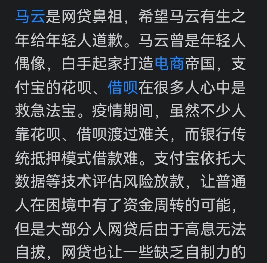 现在网络上开始有人声讨马云了,这位中国电子商务的鼻祖,网贷的祖师爷,一度是中国万千创业者的偶像,也是鲜少登上美国《时代周刊》的封面人物! 不否认阿里巴巴是一家伟大的公司,但自从做了网贷后,让多少人(尤其是年轻人)不劳而获,甘愿堕落,今天花着明天的钱。一旦还不上就被网贷公司,各种催收不择手段的打击,很多年轻人因此而走上了不归路。关键是早期很多没有还款的能力人,不用任何抵押也能在支付宝上借到钱,很多网贷平台也纷纷效仿,导致今日的中国成了网贷大国,也成了负债人群最多的国家! 说现在的中国人人负债一点都不为过,马云凭一己之力让成千上万的中国老百姓成功的背上了债务。当然这其中也有很多其他的原因,但如果没有阿里推出的最早p2p小贷平台的雏形,可能也不会生出无数家争相效仿的网贷公司。 你们觉得呢?