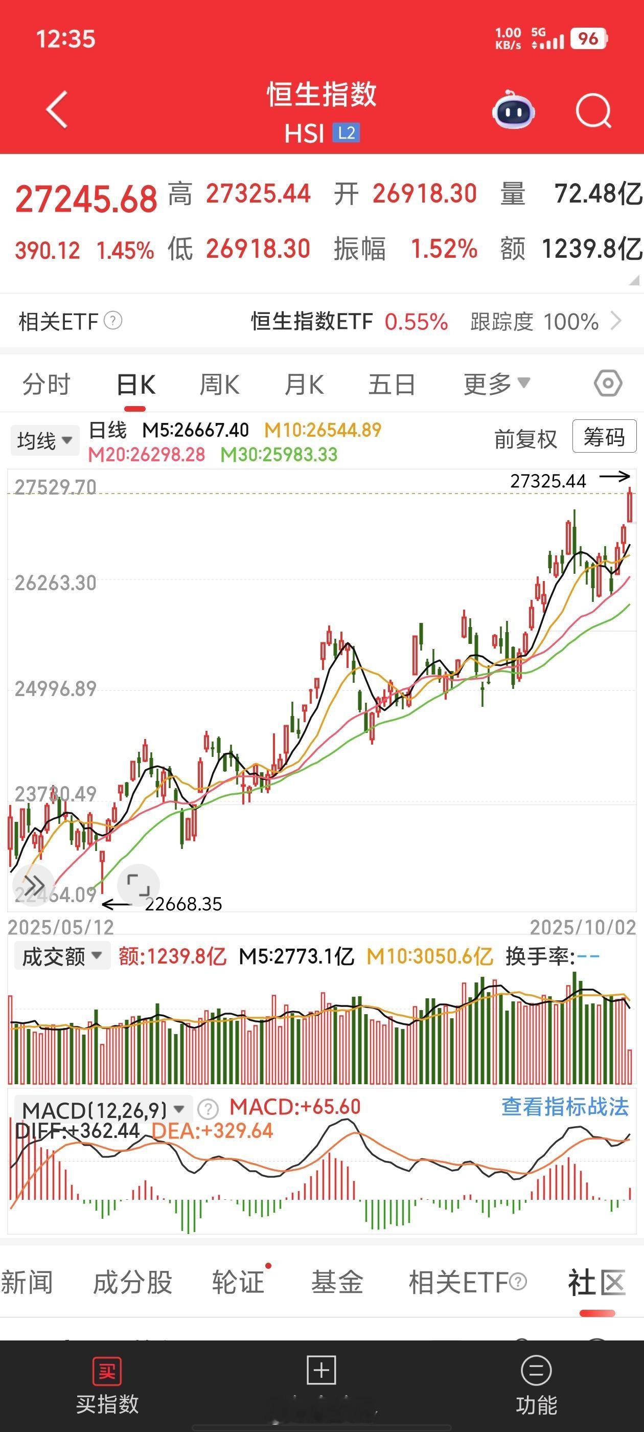 恒生指数今日开盘延续前几天上行状态继续冲高震荡创出新高