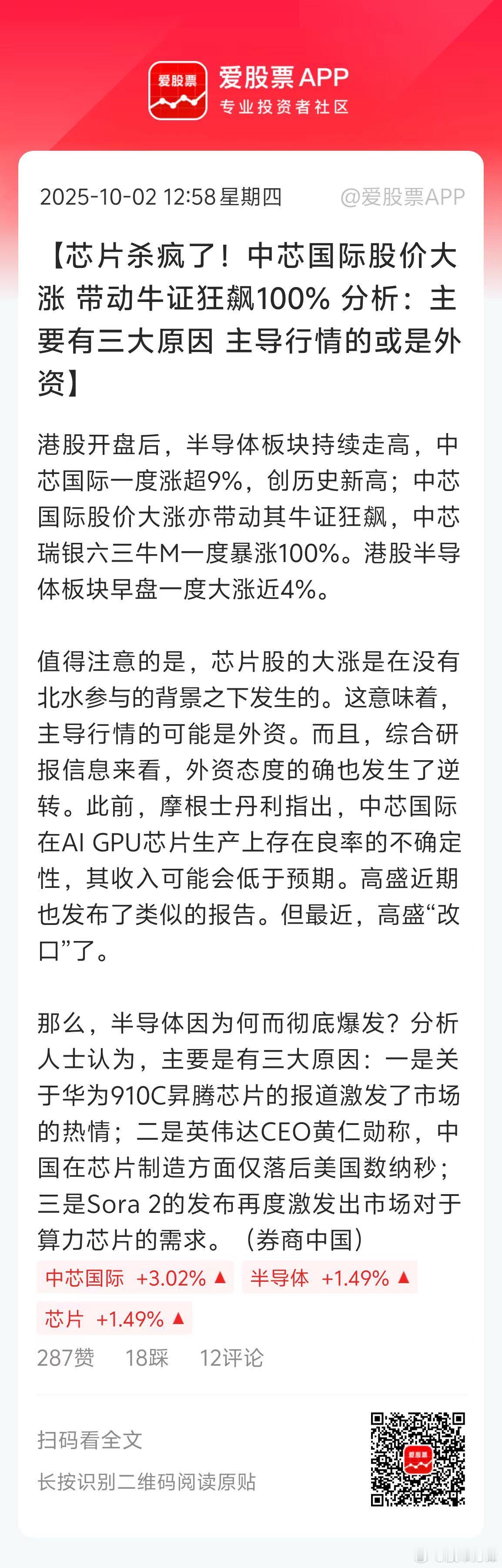 刀锋之前说过,这一轮中国资产的重估,本质上就是中国科技+高端制造的重估!在科技方面,老外开始相信我们能实现自主可控的突破,所以中芯国际开始对标台积电,阿里巴巴开始对标英伟达了!
