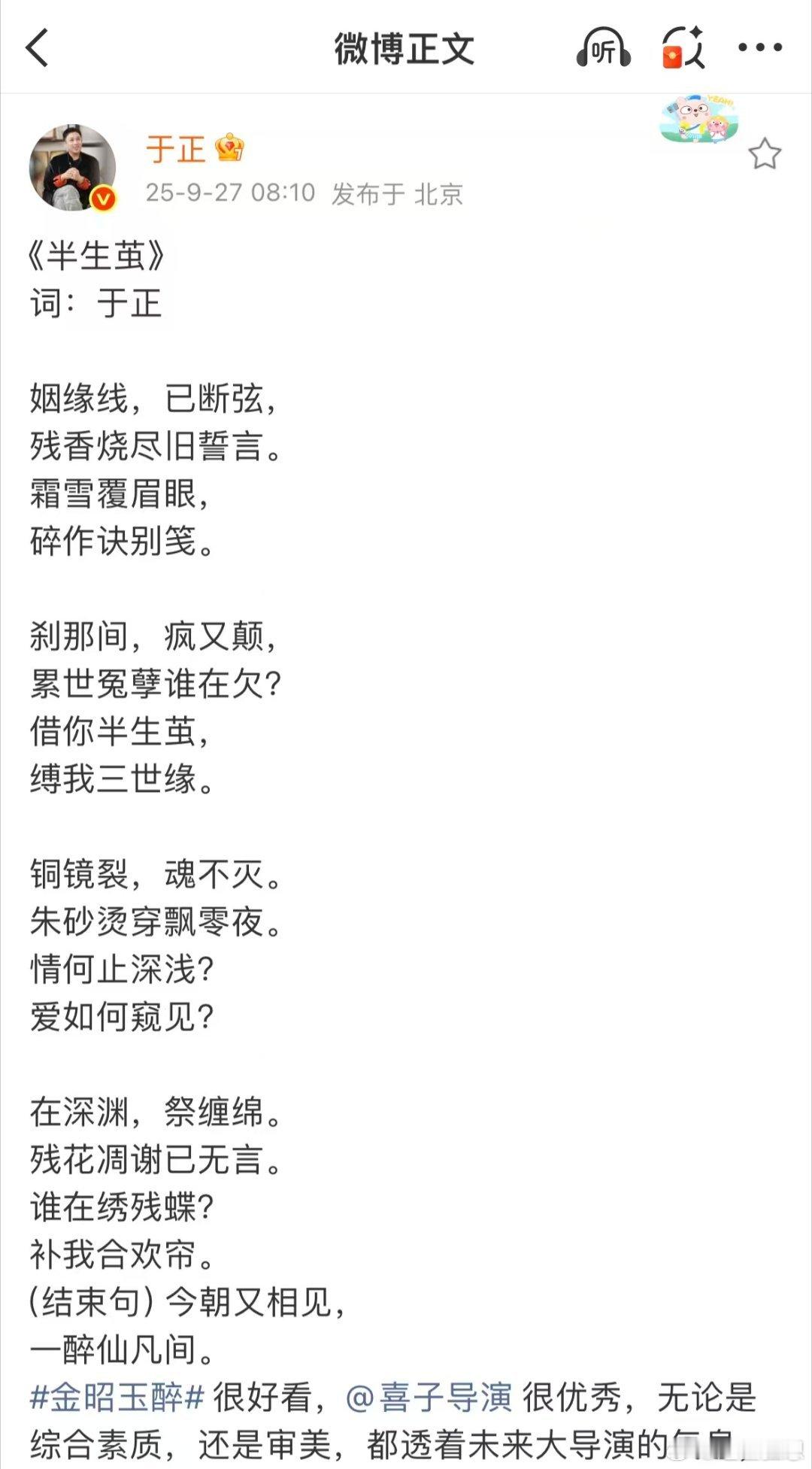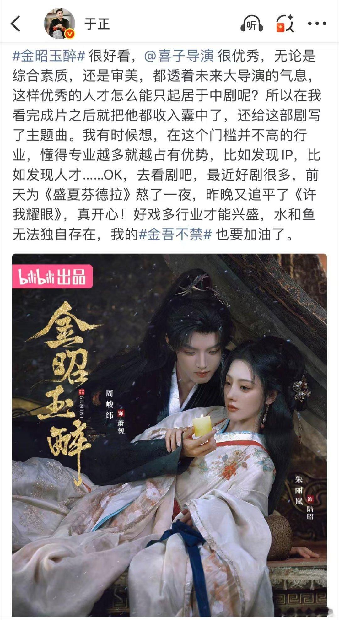 于正力挺短剧导演 彻底懂于正为啥力挺喜子导演了!《金昭玉醉》哪里是短剧,明明是电影级质感,服化布景考究,每一帧都透着用心,加上周峻纬、朱丽岚的精彩演绎,剧情高能又养眼,不追都亏!