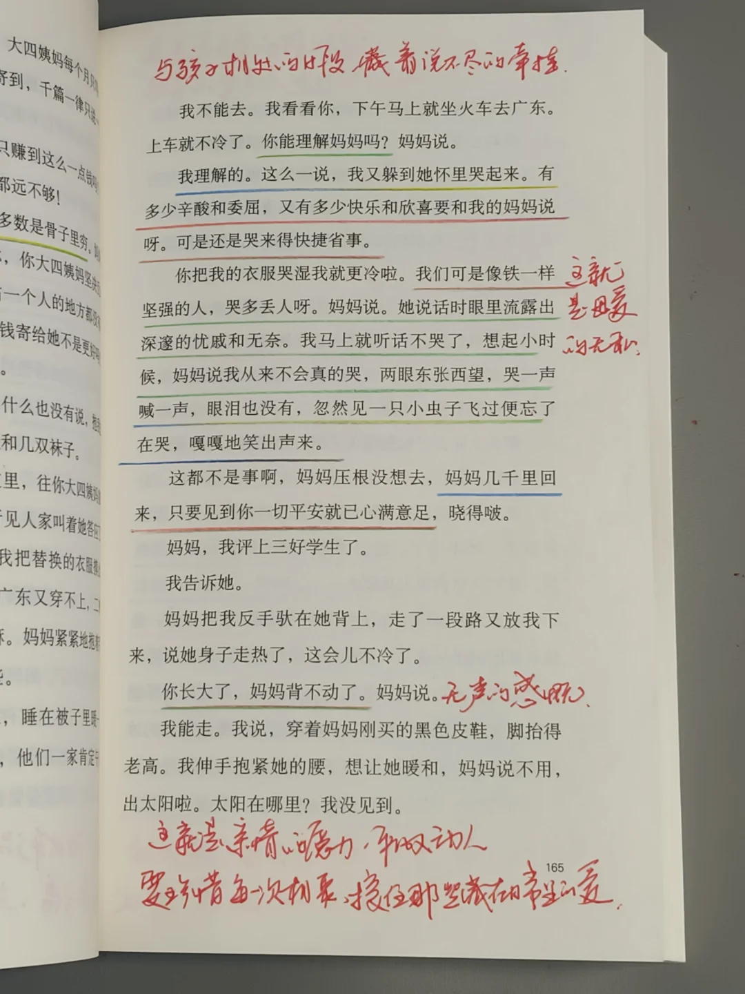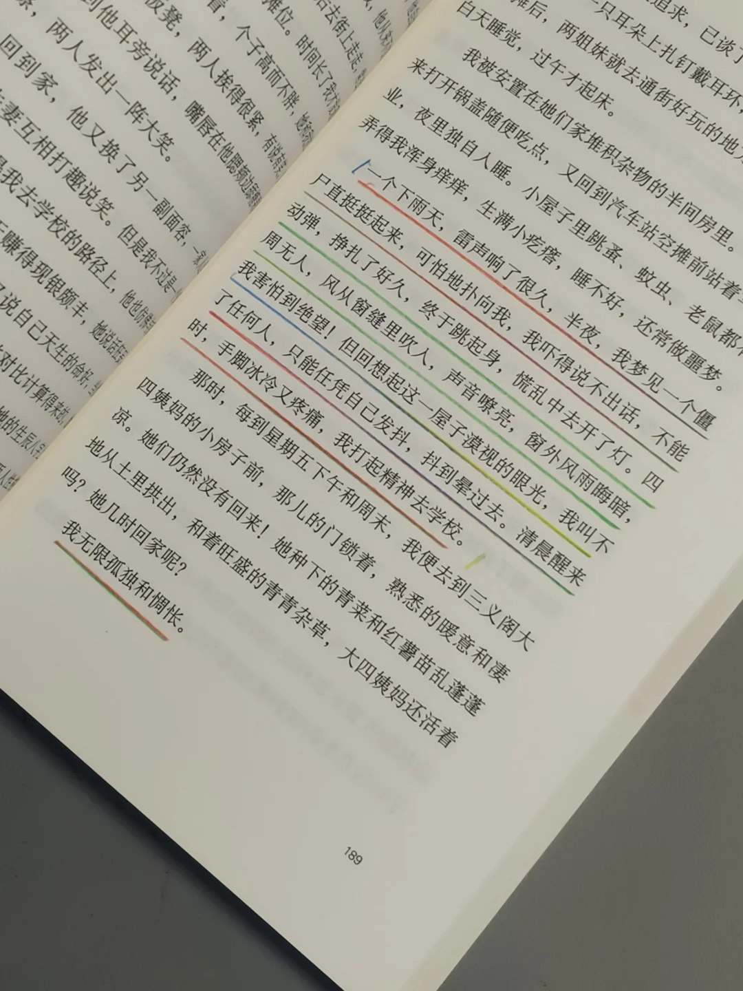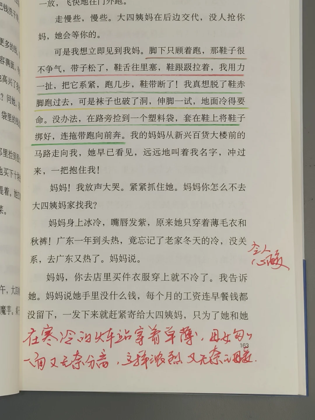 故事以“我”为视觉展开,以孩童的视觉观察成人世界,以孩童的口吻自然而然的叙述,质朴又饱含深情,这种真实感,让我有了强烈共鸣,仿佛书中的“我”是我,是她,也是我自己,亲身感受她的喜怒哀乐、艰难困苦,一同经历着生活的风风雨雨。