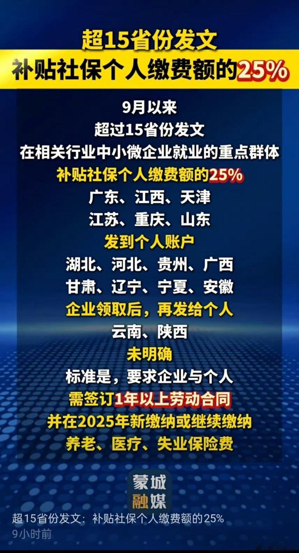 社保补贴超15省份发文:补贴社保个人缴费额的25%!大家看看有你的城市吗?