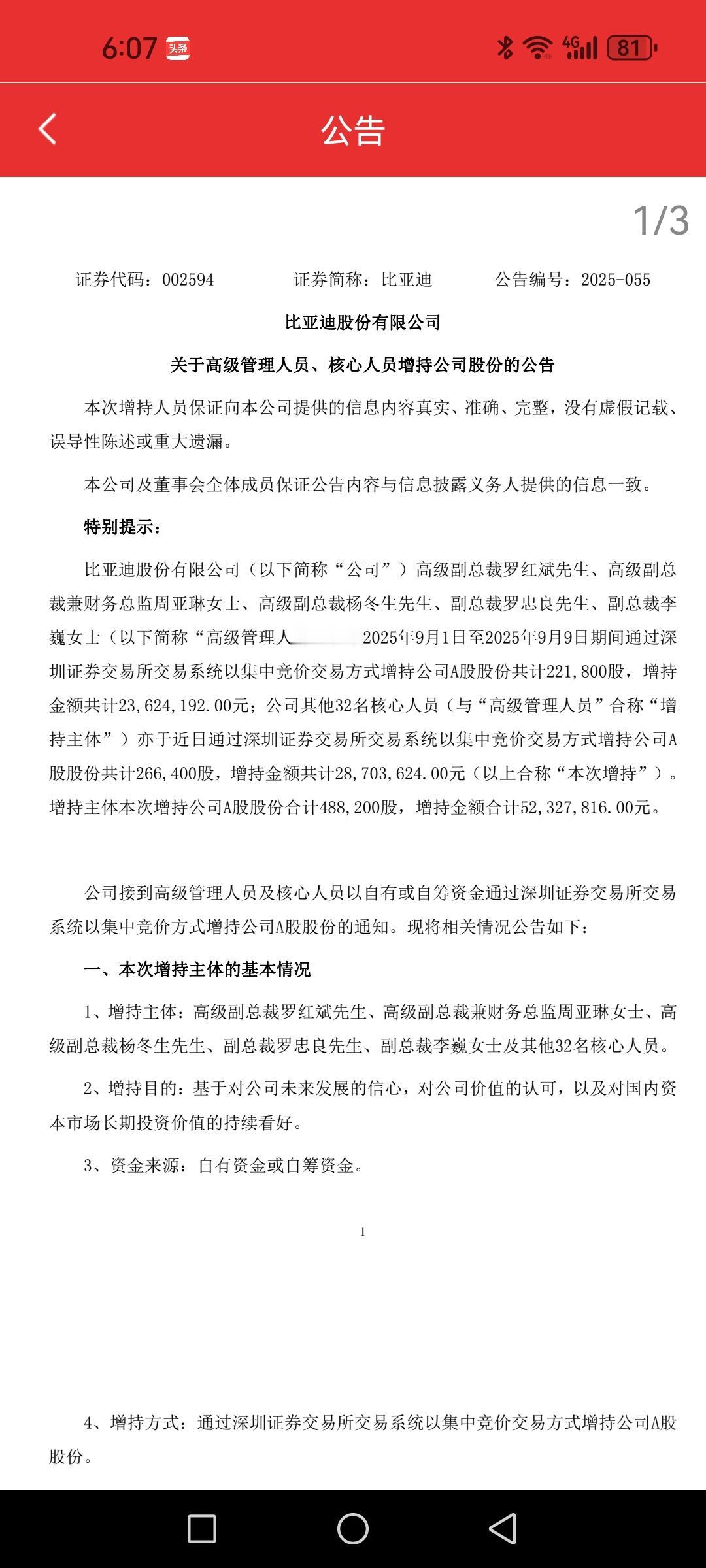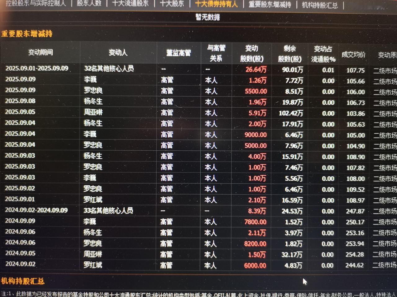 比亚迪,9月成交额1610亿,换手率达42%,创月成交额历史记录,什么意思? 从比亚迪公告信息可查询到9月上旬董监高管和33名其它核心人员合计增持48.82万股,这表明管理层对公司发展有良好的信心。 从走势上看,该股自2024年2月5日探低51.9元后反转至2025年5月23日137.67元,净涨幅达到165%。目前调整到年线上方,短期均线5、10、20、30纠缠在一起,没有明确的方向性。 自2024年5月30日站上年线后至今年8月份都是运行在年线上方,而9月份有四次收盘跌破年线。技术图形上,日线图形中,年线成为最后的强支撑线,而半年线位于所有均线上方,表明调整结构还未结束。 这里最核心和看不懂的问题就是九月份成交量创历史新高,而月K线是一个十字星,也就是说九月份收了一个放巨量的十字星。代表什么意思?主力出货还是调整结束?那么多人卖又是谁在买?个人觉得很值得关注,最后的方向决定了它未来的涨幅和跌幅都是很客观的。
