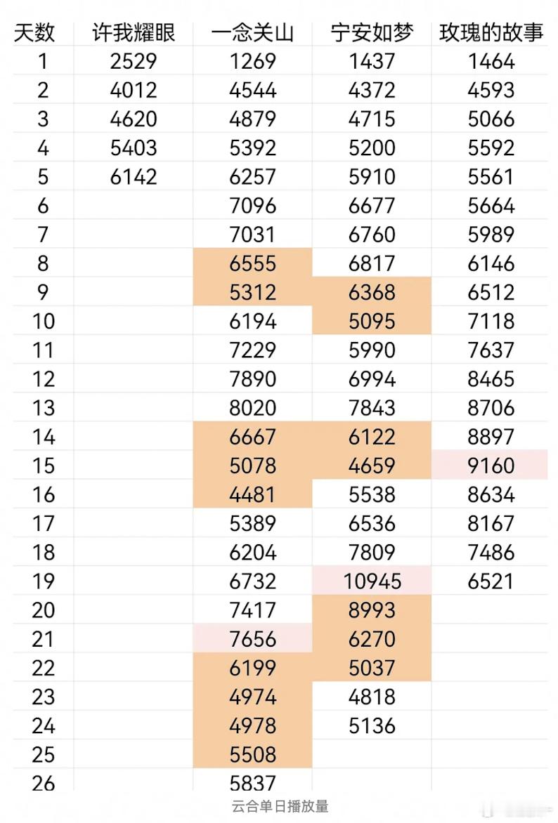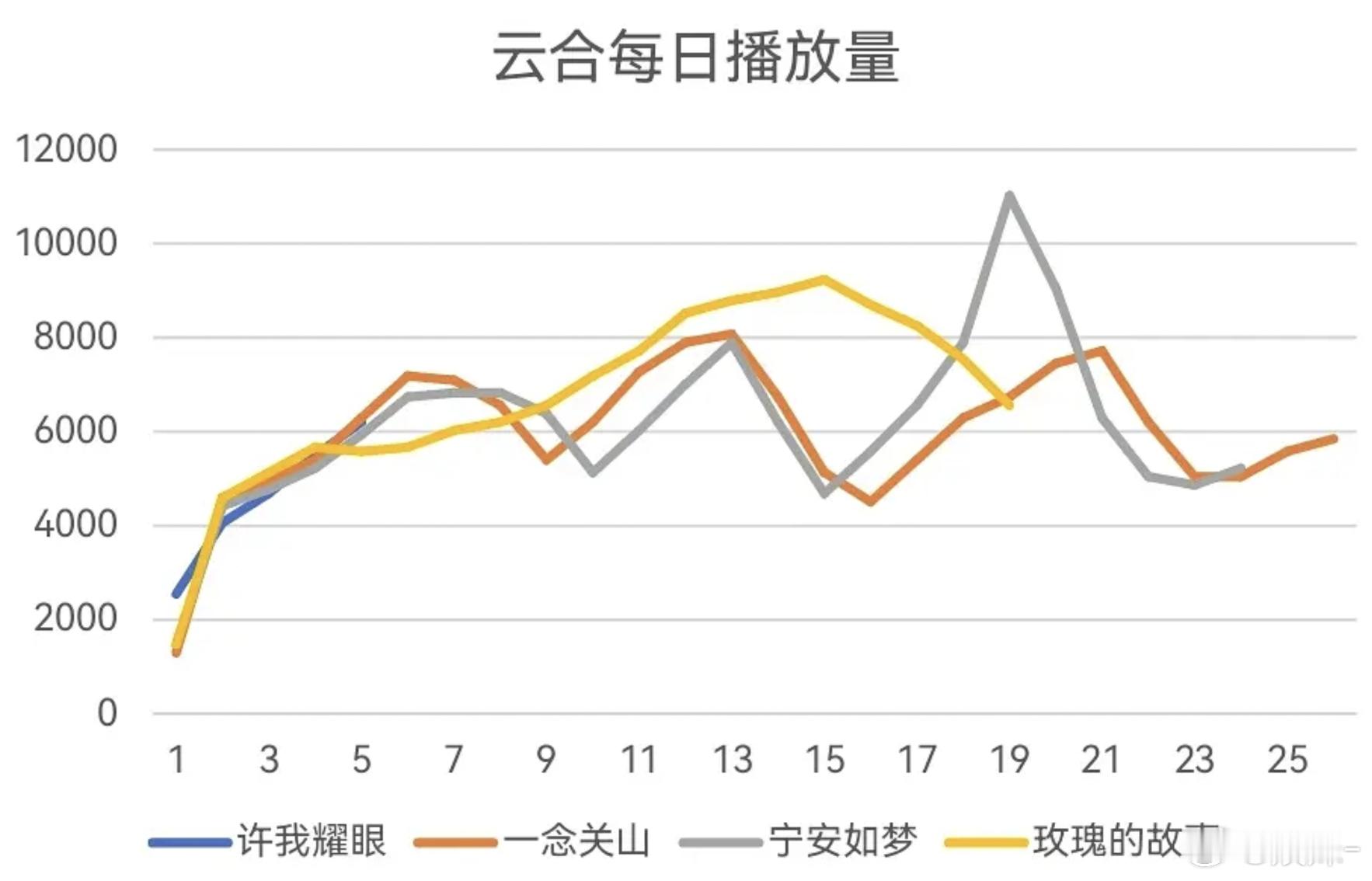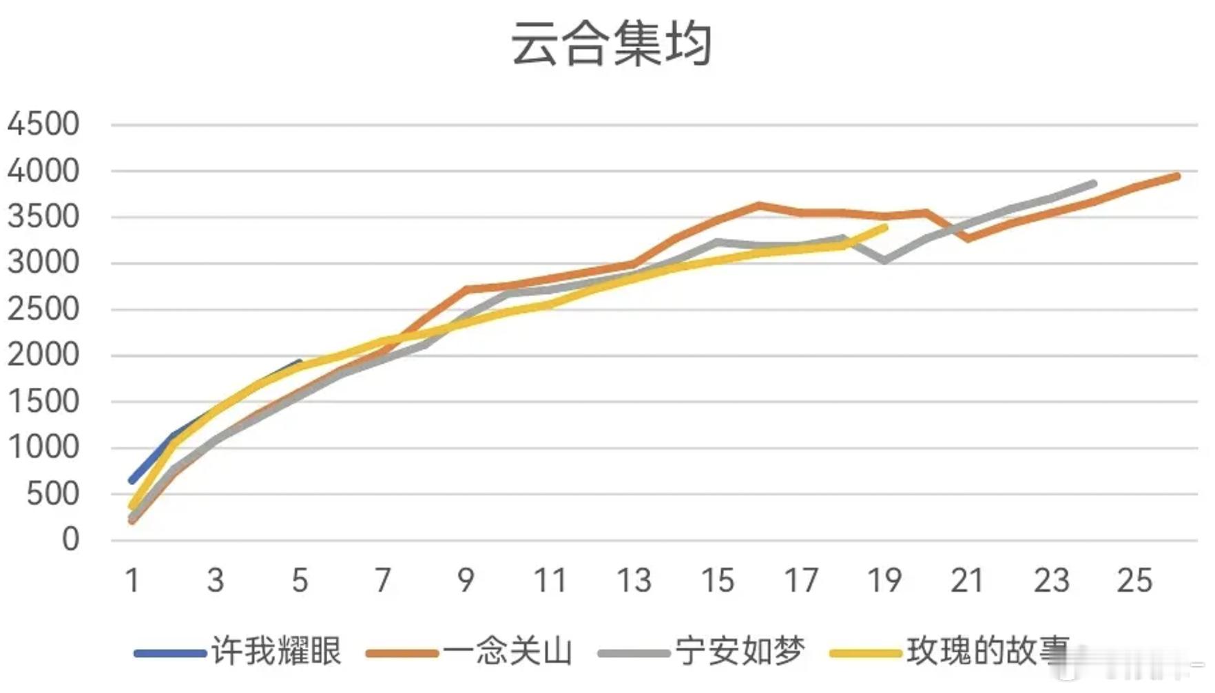 许我耀眼,一念关山,宁安如梦,玫瑰的故事云合走势对比,目前许我走势一路跳涨