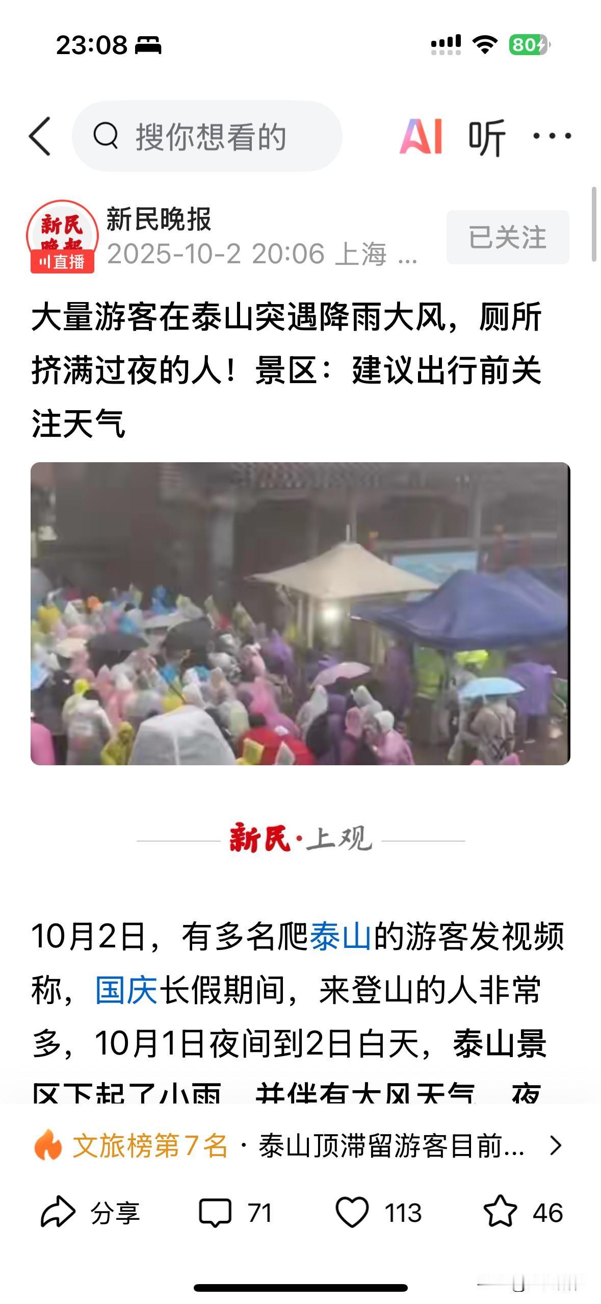 还是很佩服这些多人多和拥挤无所畏惧的游客,至少他们在金秋十月,勇敢的选择了各种出游,各种攀登。 有这些可爱的人们,才让各地景区的生意可以得到提振,让商家喜笑颜开,让员工可以拿到假期恭喜补贴。 不然大家都不出去,都像某些人一样,躲在家里刷手机,这个假期,真的白瞎了! 不过出游还是要看天气的! 祝大家玩的开心,顺利,安全第一!