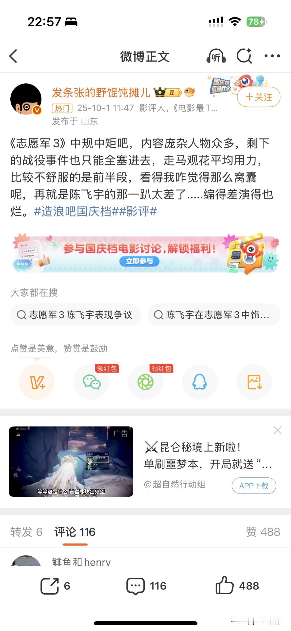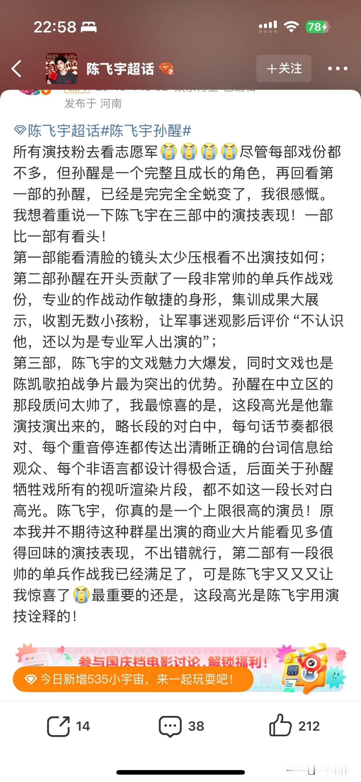 关于陈飞宇的演技,拎两条对比看看,粉丝的深度滤镜和普通观影者的无滤镜。 说实话,只能说演技也就,中规中矩吧,谈不上什么惊艳专业和出彩。毕竟老爸就是导演,什么好的镜头语言不能用心良苦呢? 一同观影的大三姐姐和高二弟弟,我看屏幕,他们更多看手机。弟弟说脚底都在抠地板,就是感觉到一种糖,一种尬,一种强行安排的感情,导演夹带私货,儿子卖力接招。 00后是忠于自己的审美和追求的。 难怪高二男生即使是免费在叔叔的电影院看电影,他都勉为其难。因为国庆档真的没有好看的电影。 未来到他们买单的时候,他们会影响未来的导演和电影艺术创作吧!? 希望00后可以脱离父辈的影响,开拓出属于他们自己独特见解和个性风格的全新艺术作品! 陈飞宇也没辙,以他的自身条件,没有了老爸老妈的光环和照顾,在别的剧组他能获得这样的机会吗? 除非资源交换吧。