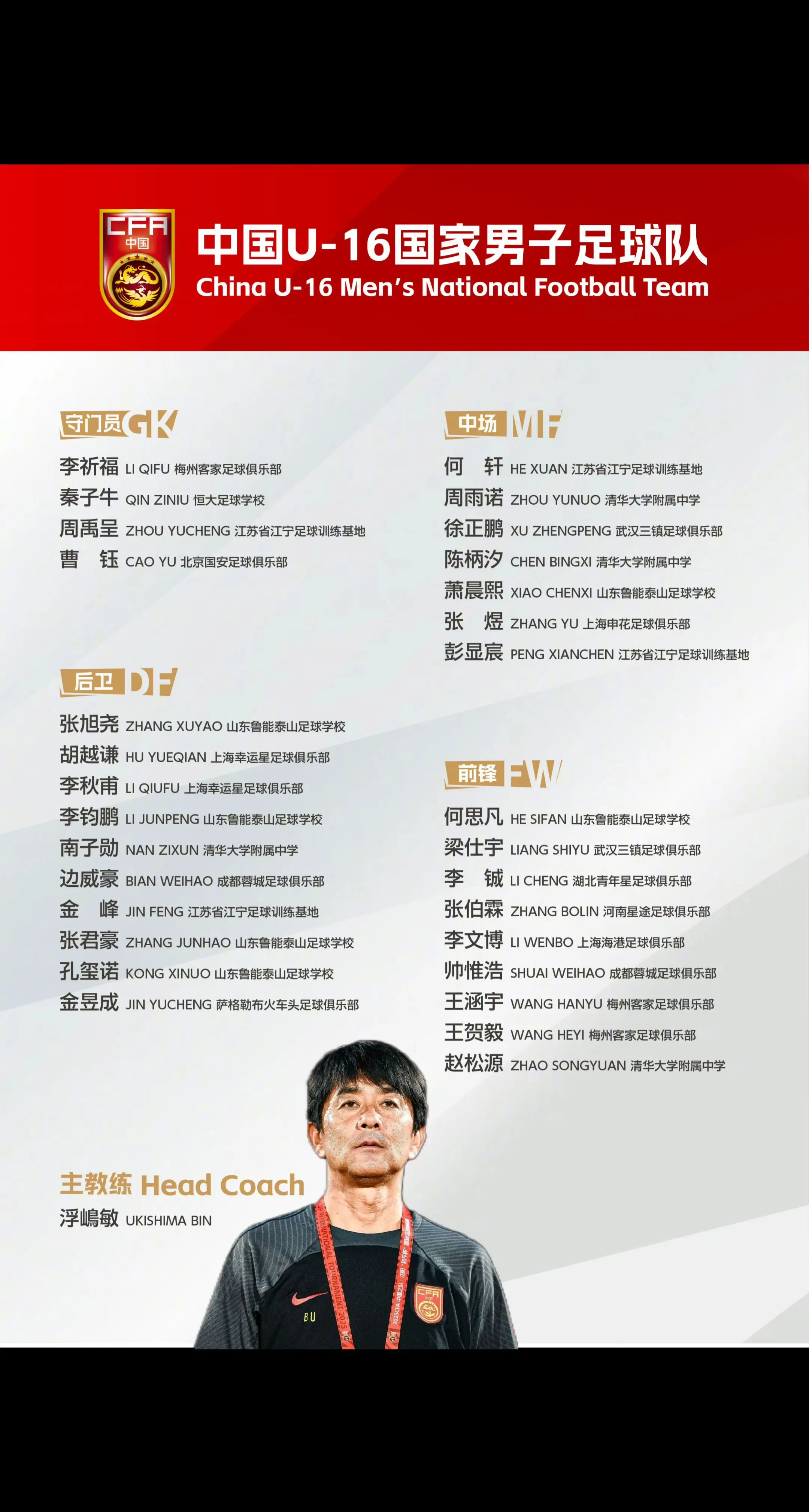 U16国家男子足球队定于2025年9月30日至10月17日赴香河国家足球训练基地组织集训。