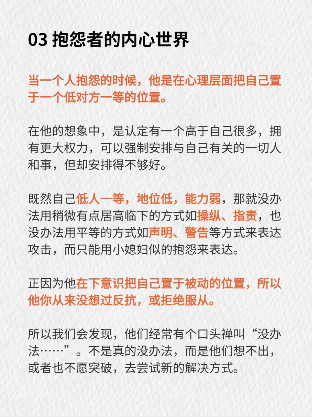 当一个人抱怨的时候,他是在心理层面把自己置于一个低对方一等的位置。