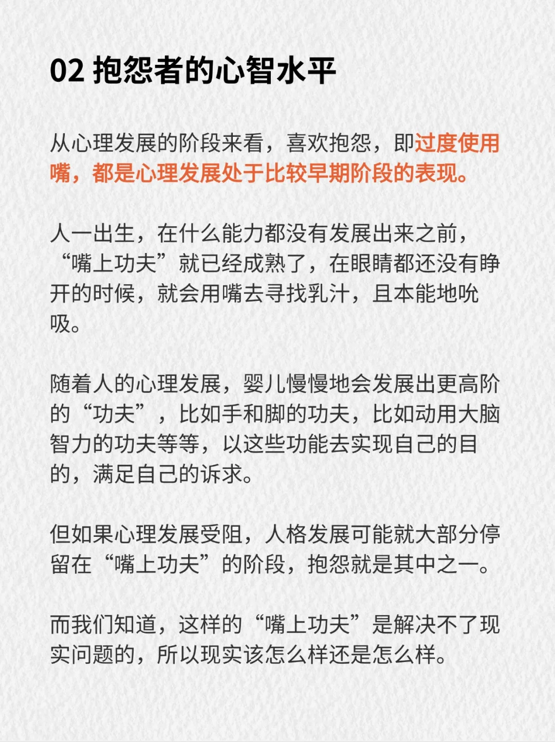 但如果心理发展受阻,人格发展可能就大部分停留在“嘴上功夫”的阶段,抱怨就是其中之一。
