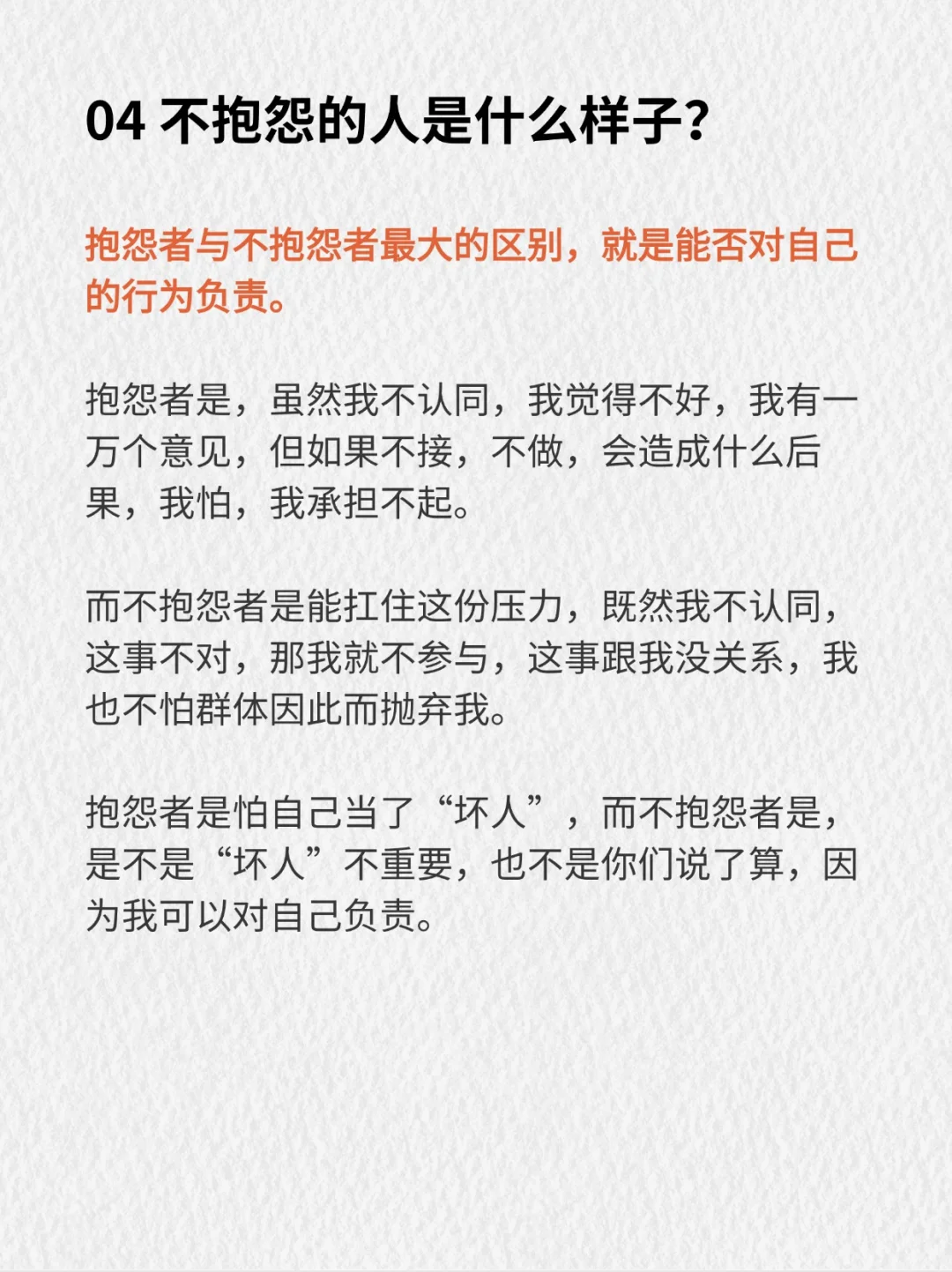 而不抱怨者是能扛住这份压力,既然我不认同,这事不对,那我就不参与,这事跟我没关系,我也不怕群体因此而抛弃我。