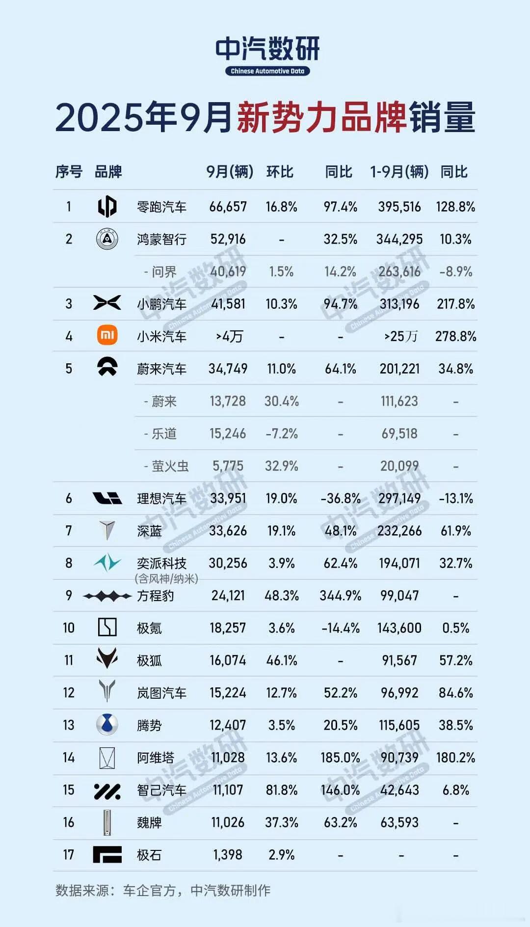 新势力前五是:零跑,鸿蒙智行,小鹏,小米和未来。1-9月份的累计数据,零跑,小鹏,小米和阿维塔都获得了3位数的同比增长。目前看未来几个月的月度出货量应该有4加厂商将稳定在4万台以上,成为新势力第一集团。其他厂商需要努力才有可能冲进4万的月度出货量,这个数字估计会逐渐成为一个分水岭。