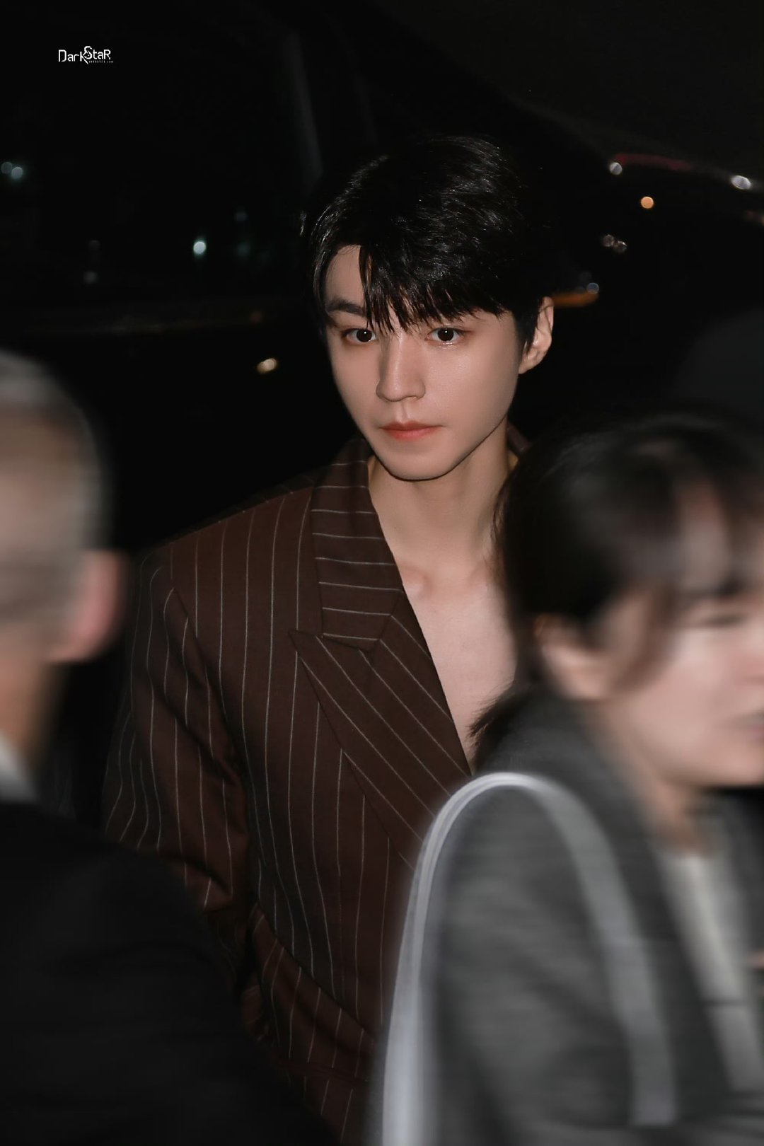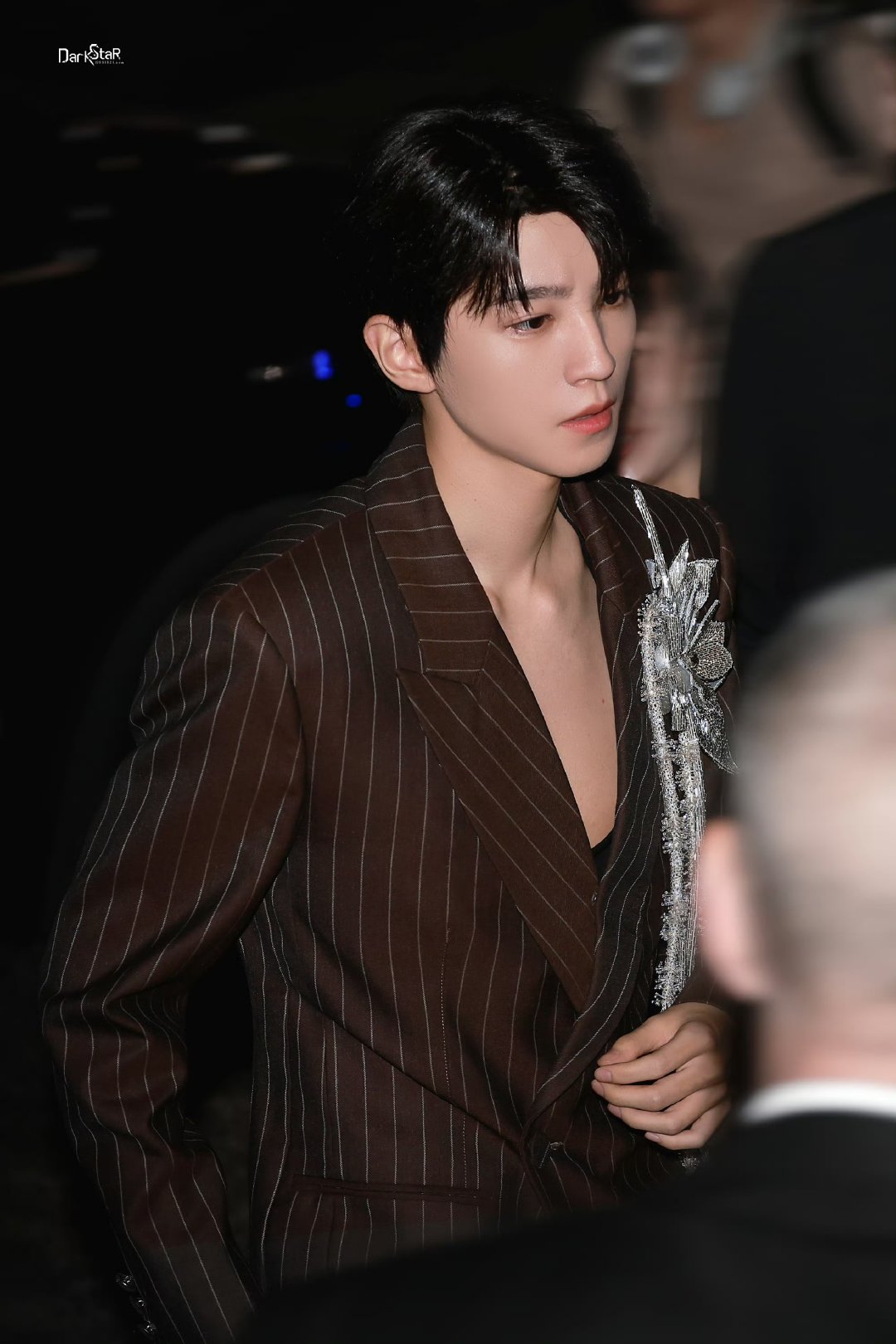王俊凯看秀G社生图王俊凯条纹深V西装G社生图镜头下的王俊凯,黑西装衬得五官俊朗