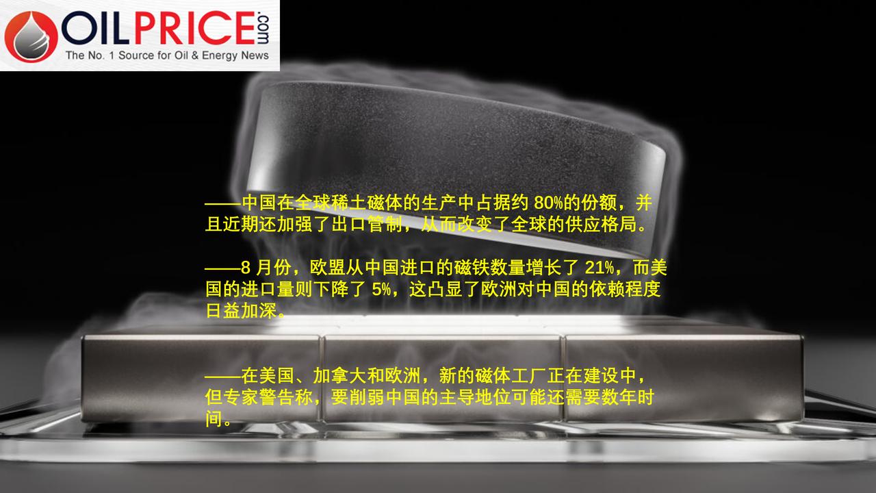 稀土磁体已成为全球力量博弈的新战场 在稀土磁体方面,资源保障问题一直是当今世界迫切需要解决的问题。这主要是因为稀土在电子、国防、车辆等领域的重要性日益凸显。 多年来,各国一直在寻求确保获取这些关键资源的途径。然而,目前 90%的供应都掌握在中国手中,而中国与美国及其他国家的关系近来并不理想。尽管各方已竭尽全力,但许多国家仍依赖中国来满足其稀土需求。如今,这种情况或许开始有所改变。 ——稀土磁体的重要性比以往任何时候都更加突出 如今,几乎每一个先进的国家都渴望拥有稀土磁体,因为它们能够以小巧的尺寸产生极强的磁力,从而能够制造出高效电机和微型组件。正是这种特性使它们能够为电动汽车、风力涡轮机、智能手机、医疗设备和国防装备等关键系统提供动力。 这些磁体具有独特的特性,比如耐热性,这使得它们在对性能和精度要求极高的应用中变得更加重要。因此,随着全球各行业向电气化和自动化转型,稀土磁体已成为战略资产,其供应链控制也越来越被视为关乎国家安全的重要事项。 ——中国的稀土磁体生产仍占主导地位 中国占据了约 80%的稀土磁体生产份额。中国每年共生产超过 20 万吨磁体,占全球供应量的绝大部分。相比之下,北美和欧洲加起来的产量不到 2000 吨,而日本和越南的产量约为 25000 吨。 大约六个月前,中国向全球其他地区供应这些磁体的情况一直进展顺利。然而,中国方面随后决定停止出口,并暂停向一些主要贸易伙伴(包括美国和欧盟)出口,此举似乎是在对拟议中的针对中国电动汽车的关税措施发出警告。自那以后,中国仍允许有限量的出口,但仍然保持严格的管控措施,以巩固其在地缘政治方面的影响力。 ——欧盟进口量上升,美国进口量下降 据最新数据显示,今年 8 月欧盟对稀土磁体的采购量有所增加,而美国的进口量则有所下降。据新闻机构彭博社报道,这表明人们对资源安全问题感到担忧,因为欧洲国家正面临全球磁体供应趋紧带来的最大压力。 与此同时,分析人士警告称,不断加剧的贸易紧张局势可能会进一步阻碍这些关键材料的获取,从而威胁到欧洲的绿色技术目标,并削弱其工业竞争力。 总体而言,8 月份中国对欧盟的出口量增长了 21%,达到 2582 吨。与此同时,对美国的出口量环比下降了 5%,约为 590 吨。数据显示,欧盟对稀土磁体的依赖程度明显上升,因为截至目前,从中国进口的商品量是美国的三倍。专家表示,这一数据凸显了全球供应格局的重大变化。 ——西方新的稀土磁体生产将会来到 目前来看,中国在稀土磁体领域的主导地位似乎还将持续下去。据《纽约时报》的一篇报道,美国正试图追赶这个东方国家。但尽管有了这些新的努力,全球大部分的磁体供应仍来自中国的工厂。 目前,美国有四家国内磁性材料工厂即将完工。与此同时,在邻国加拿大,Neo Performance Materials刚刚在爱沙尼亚的纳瓦尔开设了一家大型工厂。该工厂的规模几乎使欧洲和美国的产能翻了一番,并且未来有可能达到 5000 吨的产量。不过,《纽约时报》的报道还指出,全面扩产还需要一段时间。 北美和欧洲每年总共购买约 4 万吨稀土磁体。因此,在美国及其他一些国家建立磁体工厂似乎是一种摆脱中国困境的办法。 然而,中国在这一领域的主导地位源于数十年来的大量投资以及对稀土加工的近乎完全的控制。中国生产了全球大部分的精炼设备,并雇用了几乎所有的专业技术人员。一些分析人士表示,要完全打破这种垄断局面需要数年时间——甚至长达十年。