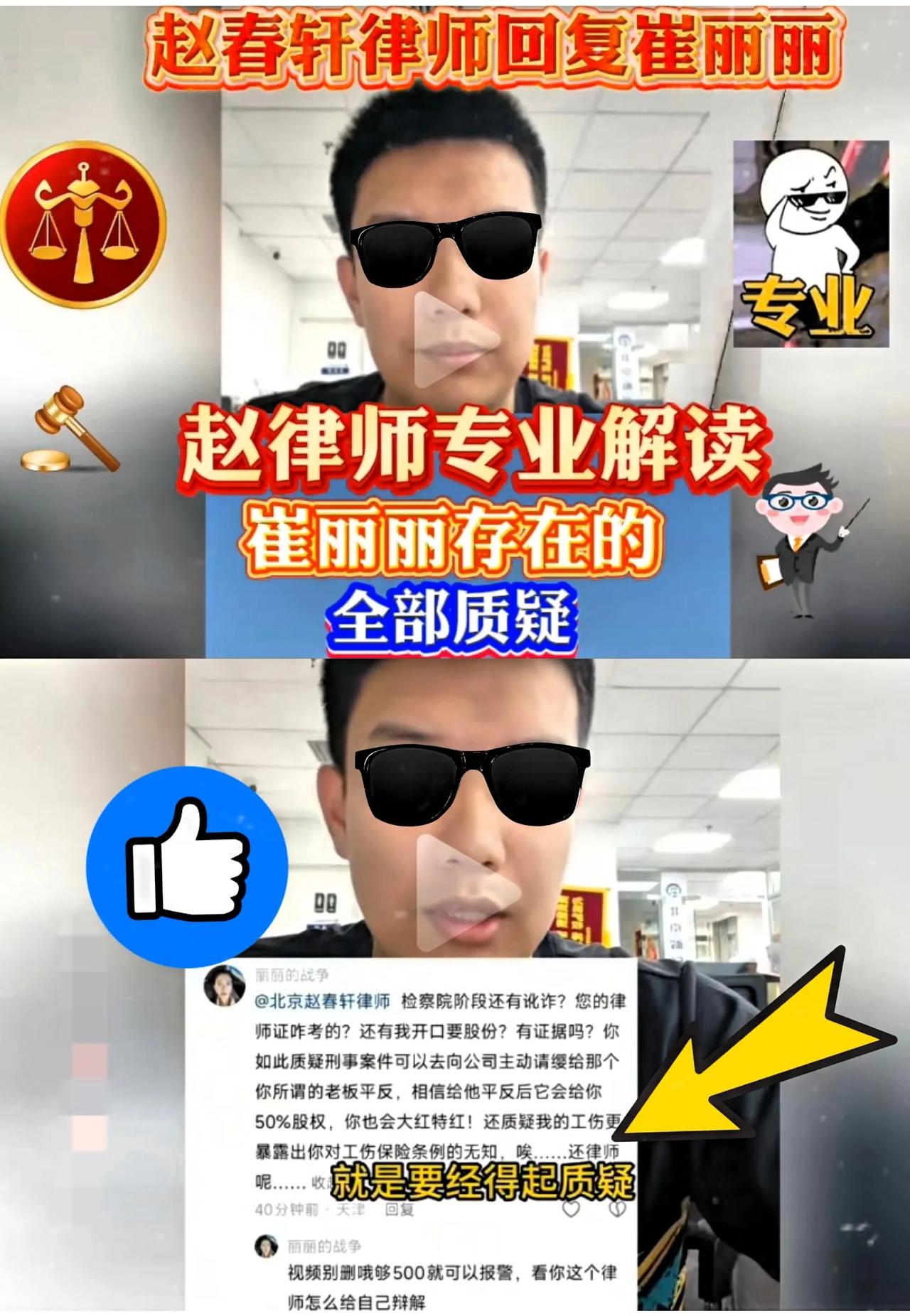 崔丽丽这次算碰上硬茬了! 有个北京的赵律师质疑了崔丽丽的异常行为后,崔丽丽直接