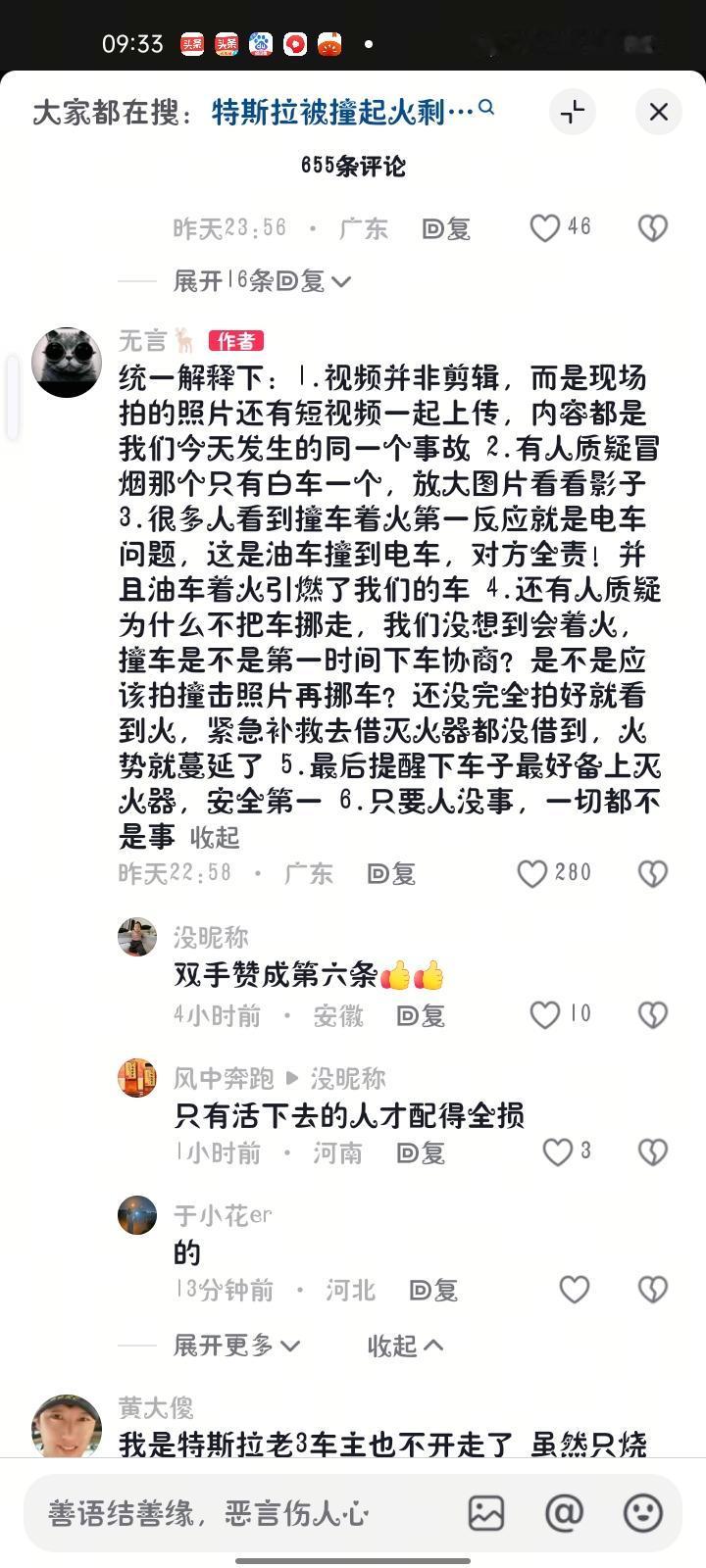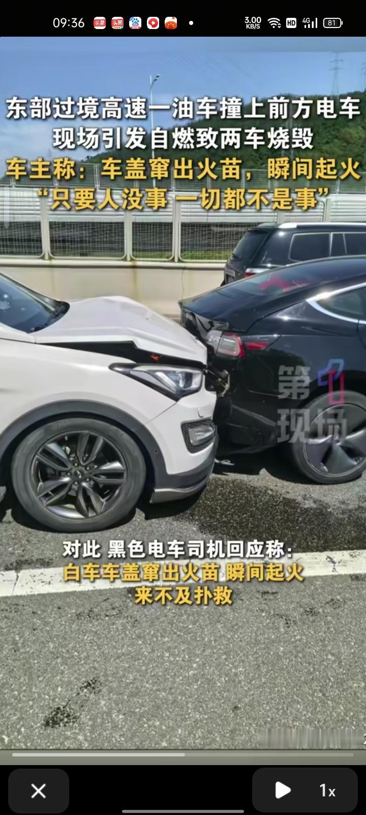 10月2日,广东深圳。网友发视频称,武深高速深圳段有一白色油车撞上前方黑色电车,现场引发自燃致两车烧毁。对此,黑色电车车主回应称,白车车盖窜出火苗,瞬间起火,来不及扑救。手机、包都在车上彻底烧毁,只要人没事,一切都不是事,提醒大家车上最好备上灭火器。