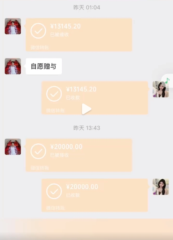 照片里是宋浩然送给她的爱马仕包包和转账记录,转账金额为13145.20、20000,并写明了是自愿赠予。