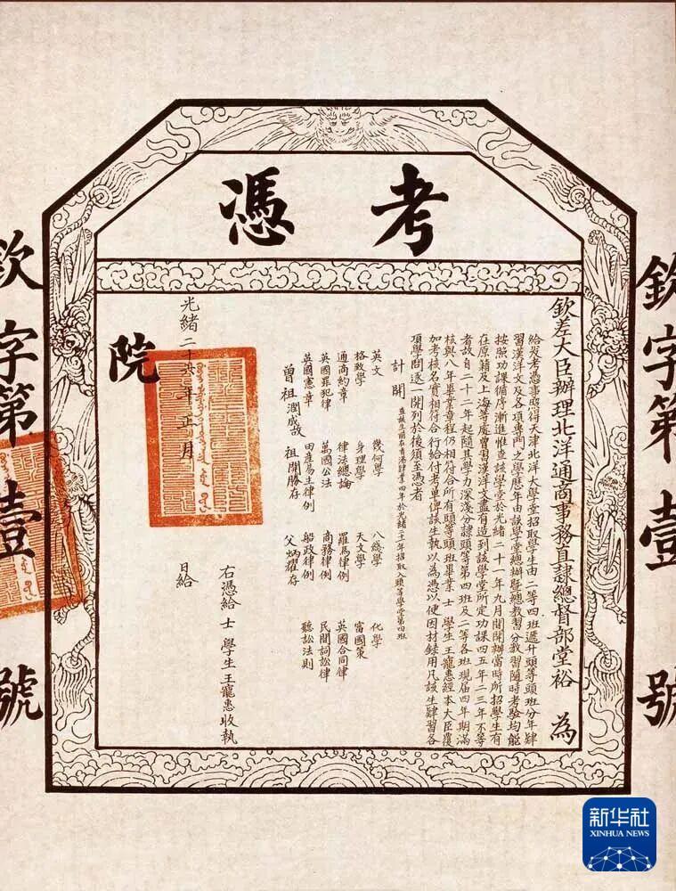 这是北洋大学堂授予法科生王宠惠的考凭。