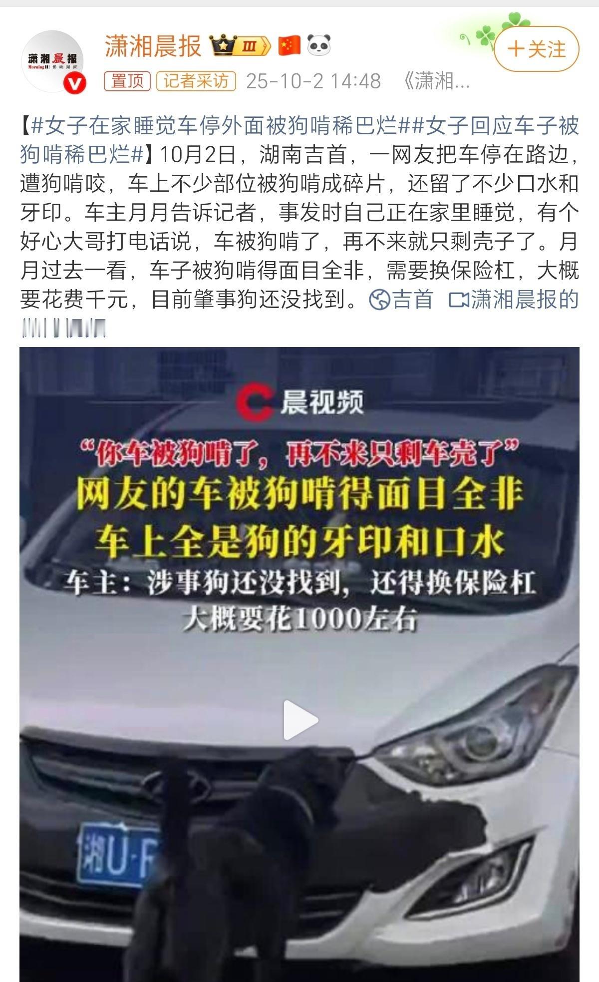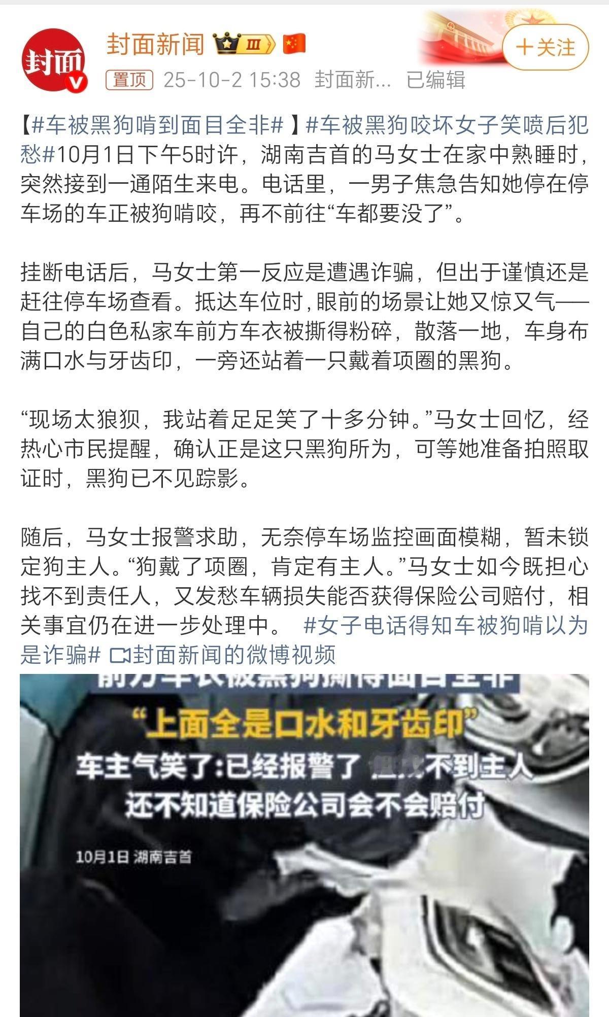 有些事情,遇到了就是遇到了。 看报道,女子在家中熟睡时接到电话,被告知其车正在被狗啃咬。 虽疑惑是诈骗电话,但出于谨慎还是前往查看。 结果让其大吃一惊。 前方车衣被撕的粉碎,车身布满口水和牙齿印,旁边还🈶条黑狗。 气急而笑许久后,被提醒是黑狗所为,正当其准备取证时,黑狗已不见踪影。 报警求助,但停车场监控画面模糊,锁定不了狗主人。 还能怎么办呢? 如果赔付不了,就只能自认倒霉了呗。 车被黑狗啃到面目全非