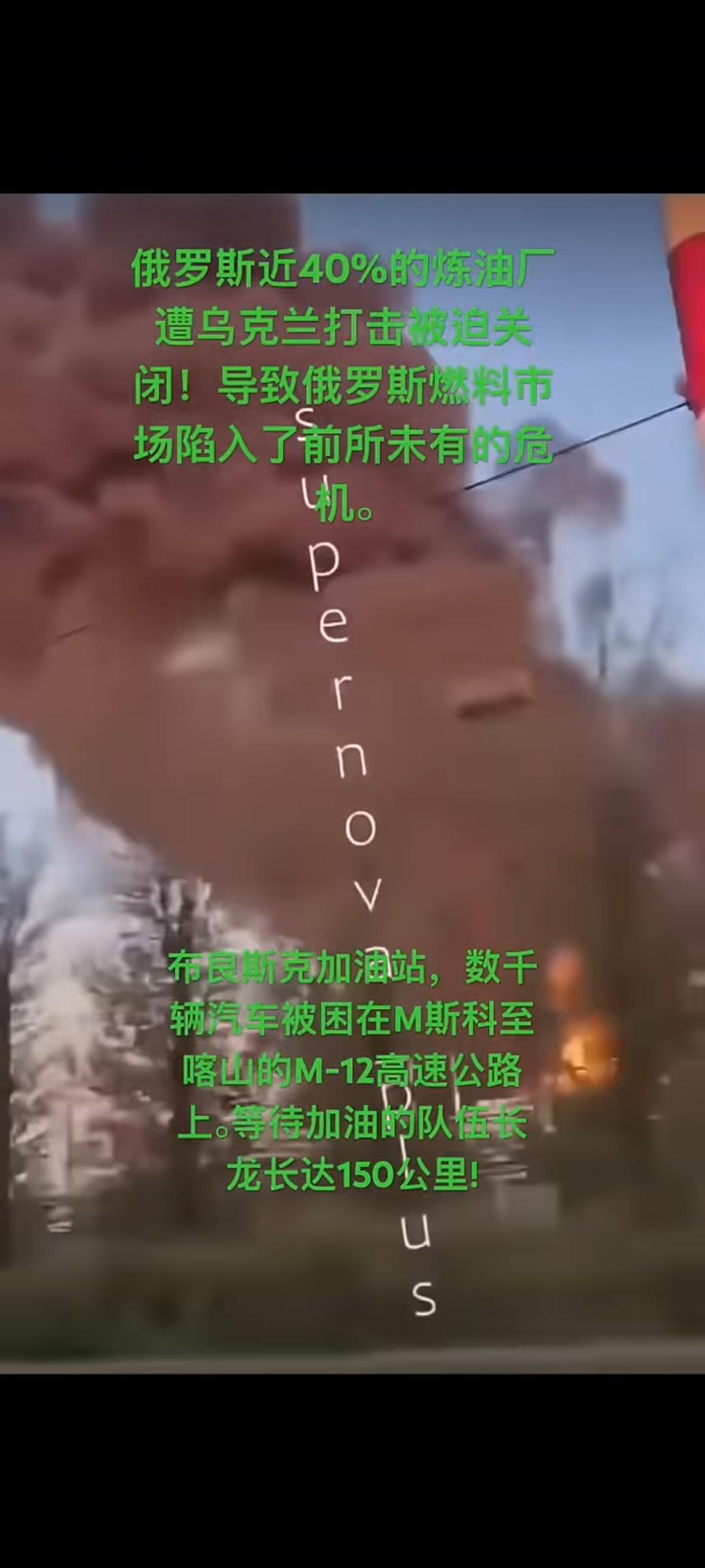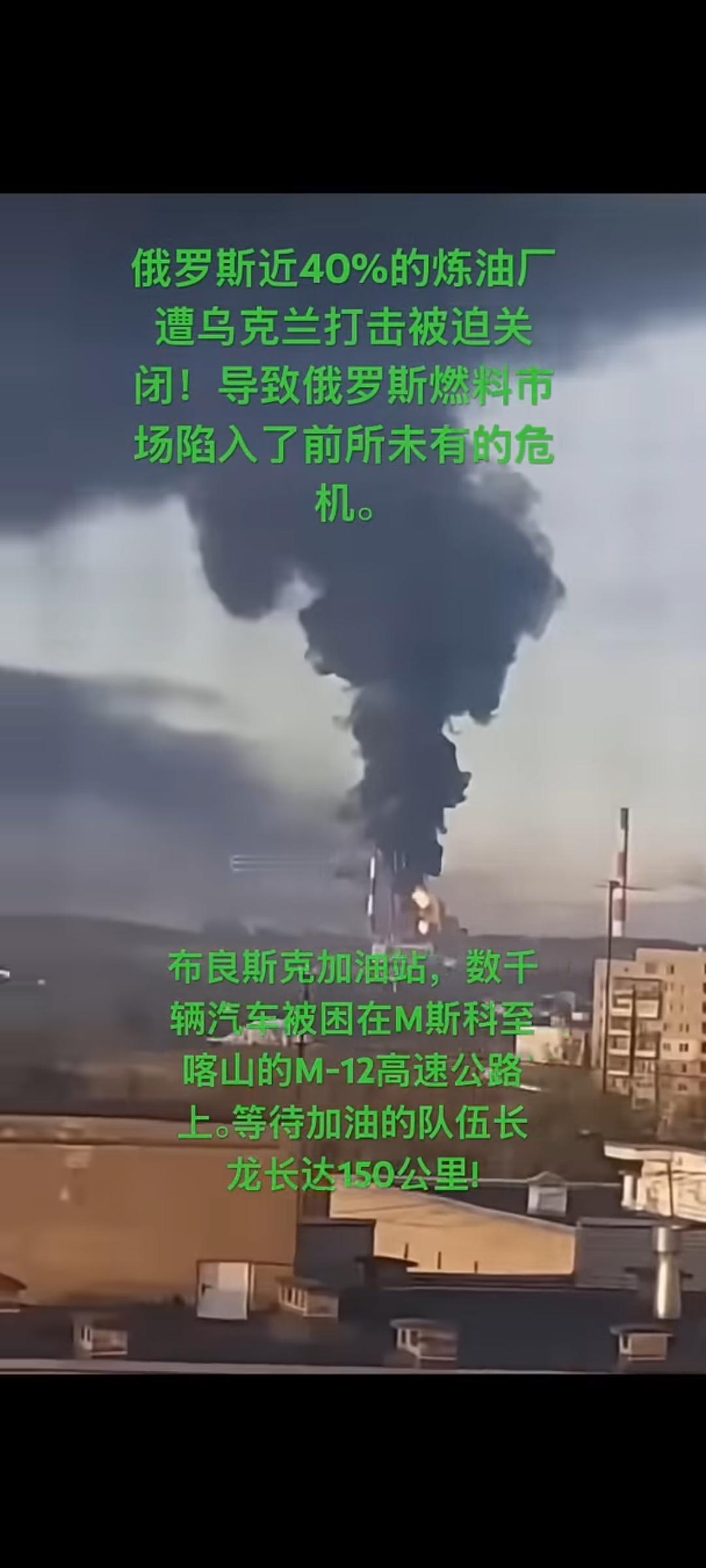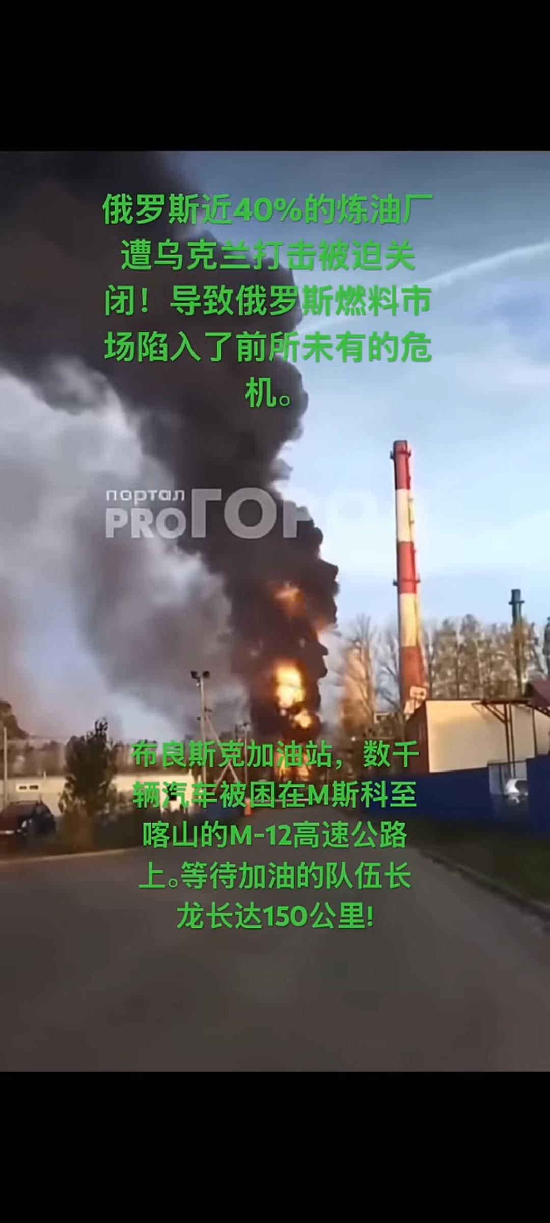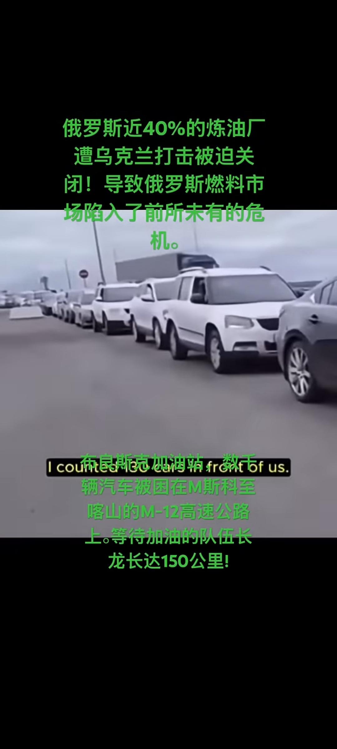 俄罗斯近40%的炼油厂遭乌克兰打击被迫关闭!导致俄罗斯燃料市场陷入了前所未有的危机。布良斯克加油站,数千辆汽车被困在M斯科至喀山的M-12高速公路上。等待加油的队伍长龙长达150公里!