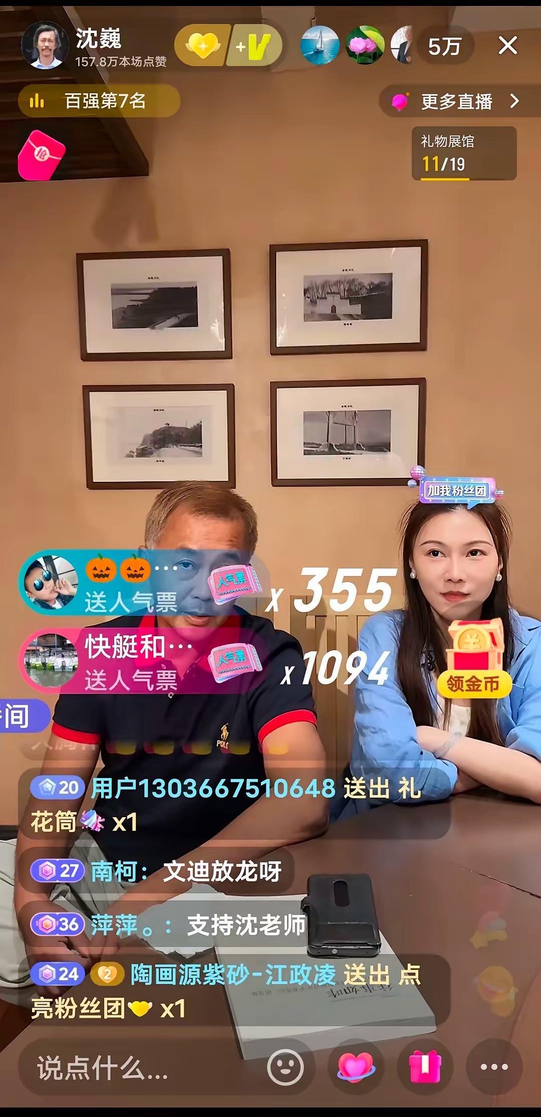 沈巍去南京和晓晓合体直播,直播间人气爆棚,各种礼物刷个不停,直播间人气一度达到十