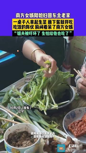 笑不活了!辽宁,南方女婿陪媳妇回东北老家,一桌子人拿起生菜、蘸下酱就开吃,吃饭的阵仗瞬间看呆了南方女婿,妹妹:“姐夫被吓坏了,生怕给他也吃了!” 对此有网友说:很奇怪,南方看你吃草他害怕,他们吃虫子吃耗子还是活的他不害怕! 也有网友说:就是时间问题,以前一起的同事,四川的,广东的,广西的,,,刚开始不吃,看我们吃他们都咧着嘴,看怪物似的看着我们吃,后来时间久了,都开始吃了,吃的还挺香! 这就是南北方吃食的差异,我算是半个北方人嫁到福建,这边黄瓜都要炒着吃,我生吃她们就跟看怪物一样,还有吃面的时候配洋葱,大蒜,简直快惊掉他们下巴了。现在我儿子也跟我一起吃,还说:吃面不吃蒜香味少一半! 一开始我老公也不会吃辣,现在被我带的也能吃辣了! 确实南方可以生吃鱼片,但生的菜她们不会吃! 个人饮食习惯,没必要强求,知道是南方女婿,就应该提前准备一些他爱吃的,这样大家都用餐愉快,非要逼他吃,估计会拉肚子! 对此你怎么看? (视频来源:河南民生频道,侵删[祈祷])