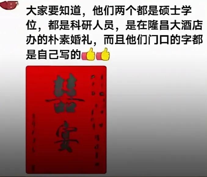 想不到吧,这竟然是一场现代人的婚礼现场! 新郎穿着普通像个路人,新娘没穿婚纱素面朝天。要不是两人胸前那朵小花,谁敢相信他们结婚了! 据了解,新郎新娘是清华大学的博士生,而且都是科研人员。 有人感慨:“他们的笑容,比我看过的任何一张精修婚纱照都真实幸福”。 也有人调侃,新娘图个啥,婚礼办得那么寒酸,这也太委屈了! 可结婚的本质是什么?难道真的要用婚纱、钻戒和五星酒店才能证明对爱情的忠贞吗? 当大多数爱情被物化为房子、车子和彩礼时,他们的爱情,却清晰地指向了共同的未来与理想。 这不是寒酸,这是底气! 这份自信,可能从他们认识的第一天起,就不是建立在婚纱和钻戒这些物质的东西上。 或许从一开始,他们就已经写下了“一辈子”的剧本。